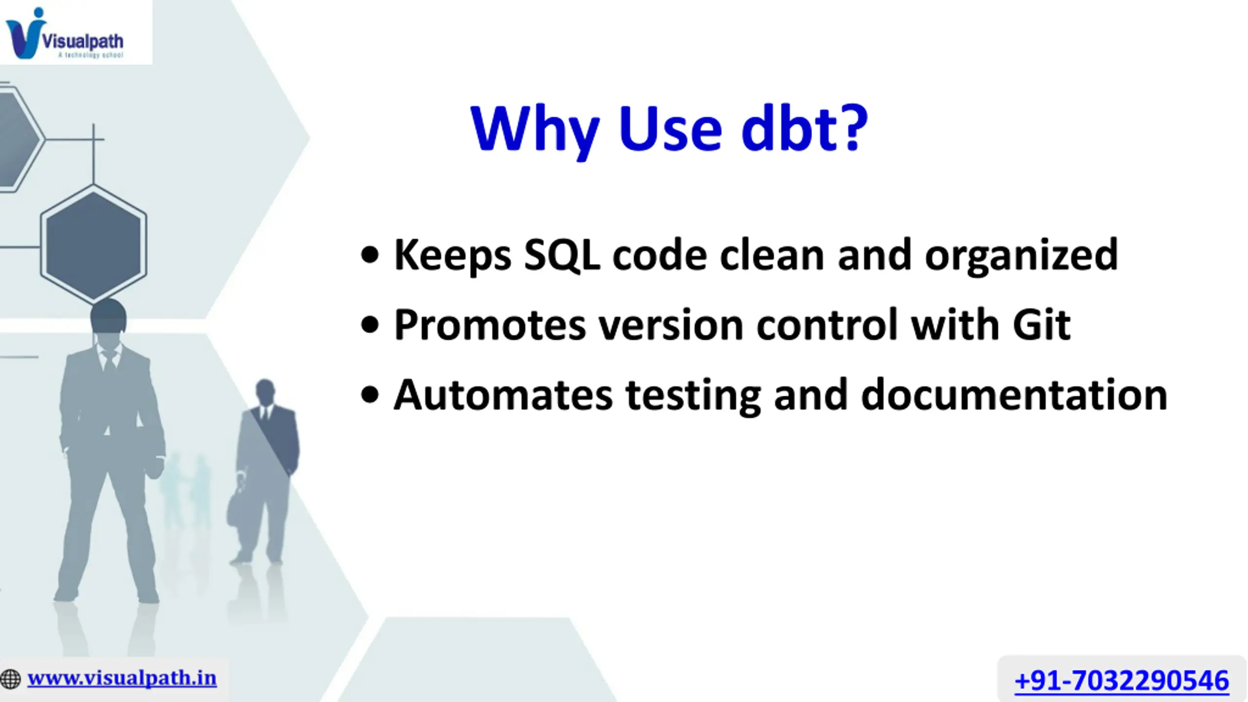 Why Use dbt? Keeps SQL code clean and organized Promotes version control with Git Automates testing and documentation +91-7032290546