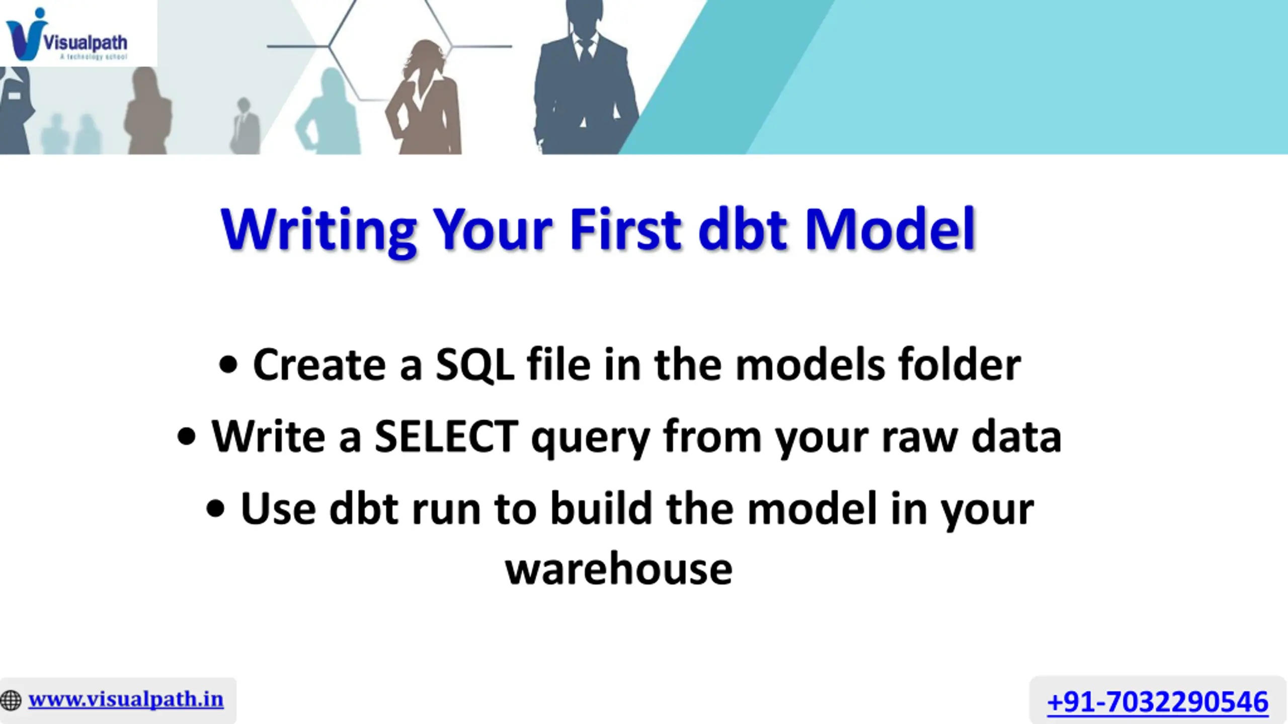 Writing Your First dbt Model Create a SQL file in the models folder Write a SELECT query from your raw data Use dbt run to build the model in your warehouse +91-7032290546
