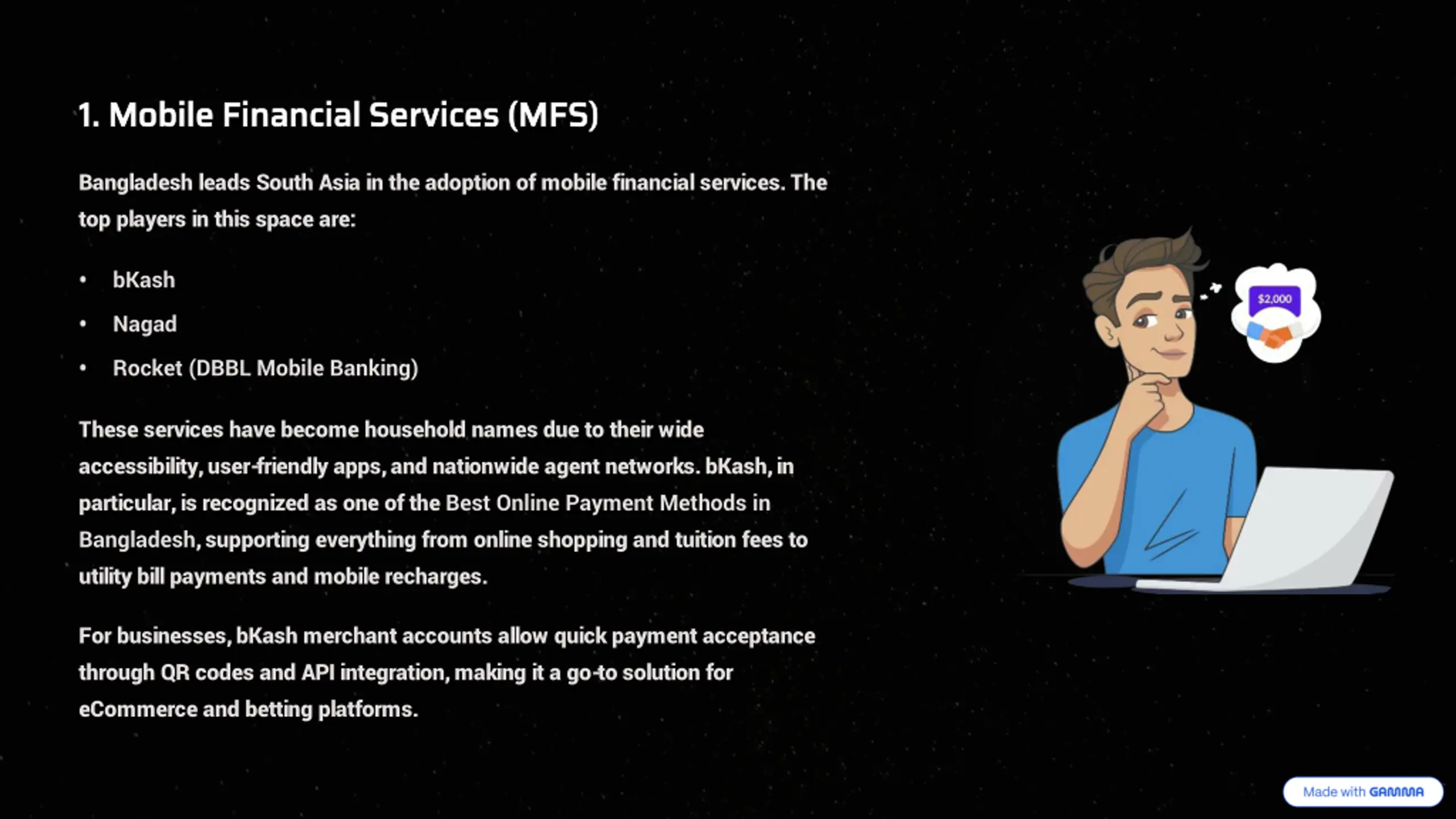 1. Mobile Financial Services (MFS) 1. Mobile Financial Services (MFS) Bangladesh leads South Asia in the adoption of mobile financial services. The top players in this space are: bKash Nagad Rocket (DBBL Mobile Banking) These services have become household names due to their wide accessibility, user-friendly apps, and nationwide agent networks. bKash, in particular, is recognized as one of the Best Online Payment Methods in Bangladesh, supporting everything from online shopping and tuition fees to utility bill payments and mobile recharges. For businesses, bKash merchant accounts allow quick payment acceptance through QR codes and API integration, making it a go-to solution for eCommerce and betting platforms. preencoded.png