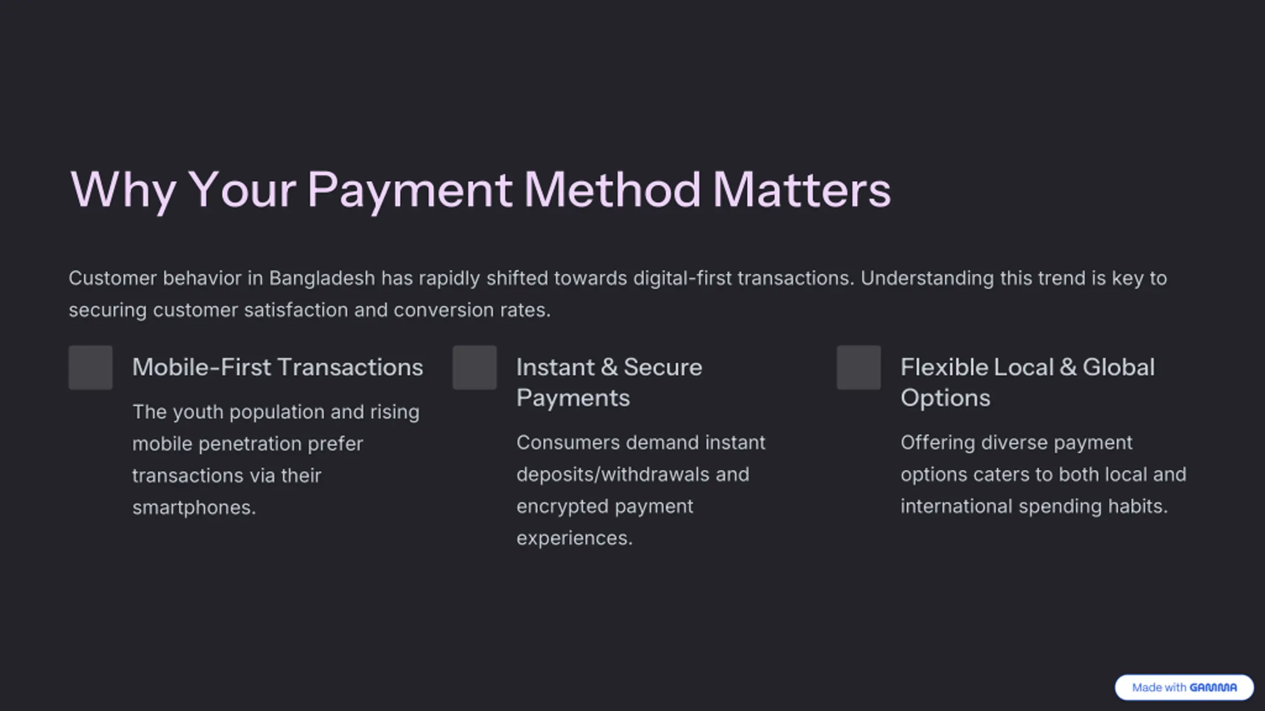 Why Your Payment Method Matters Customer behavior in Bangladesh has rapidly shifted towards digital-first transactions. Understanding this trend is key to securing customer satisfaction and conversion rates. Mobile-First Transactions Instant & Secure Payments Flexible Local & Global Options The youth population and rising mobile penetration prefer transactions via their smartphones. Consumers demand instant deposits/withdrawals and encrypted payment experiences. Offering diverse payment options caters to both local and international spending habits. preencoded.png