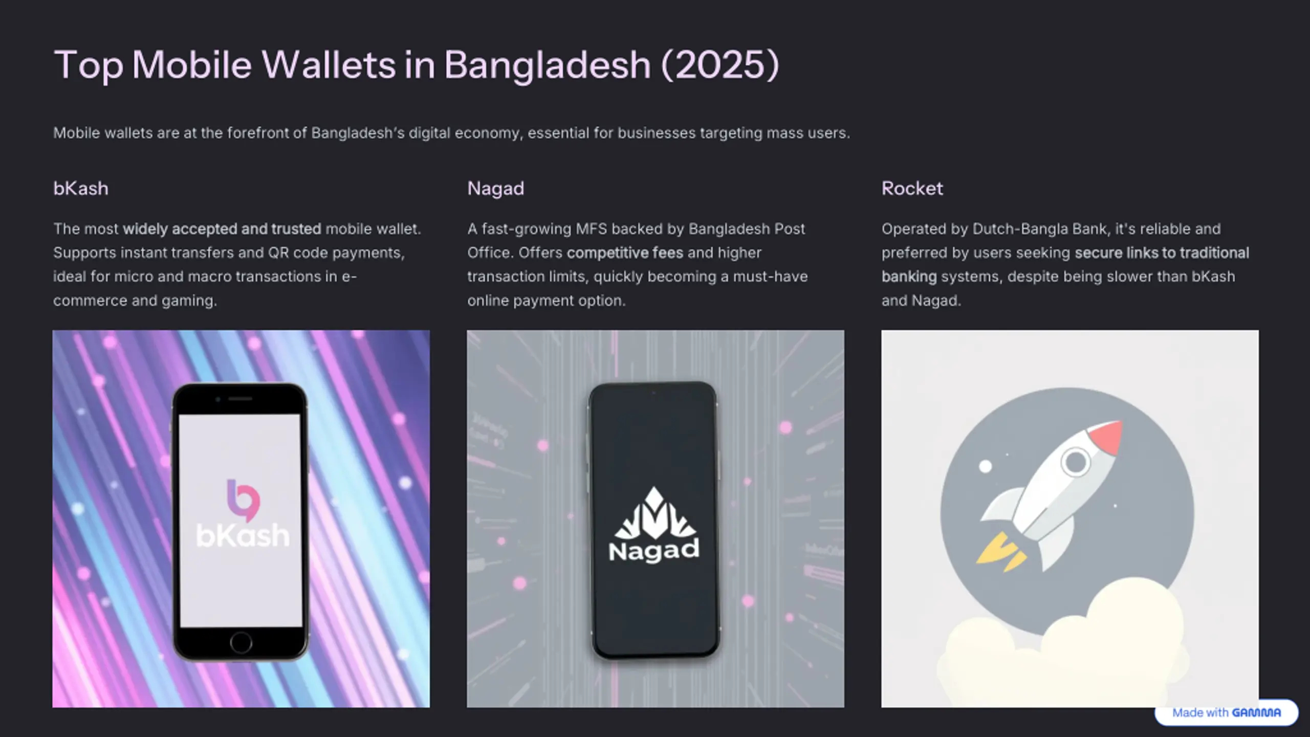 Top Mobile Wallets in Bangladesh (2025) Mobile wallets are at the forefront of Bangladesh s digital economy, essential for businesses targeting mass users. bKash Nagad Rocket The most widely accepted and trusted widely accepted and trusted mobile wallet. Supports instant transfers and QR code payments, ideal for micro and macro transactions in e- commerce and gaming. A fast-growing MFS backed by Bangladesh Post Office. Offers competitive fees competitive fees and higher transaction limits, quickly becoming a must-have online payment option. Operated by Dutch-Bangla Bank, it's reliable and preferred by users seeking secure links to traditional banking banking systems, despite being slower than bKash and Nagad. secure links to traditional preencoded.png