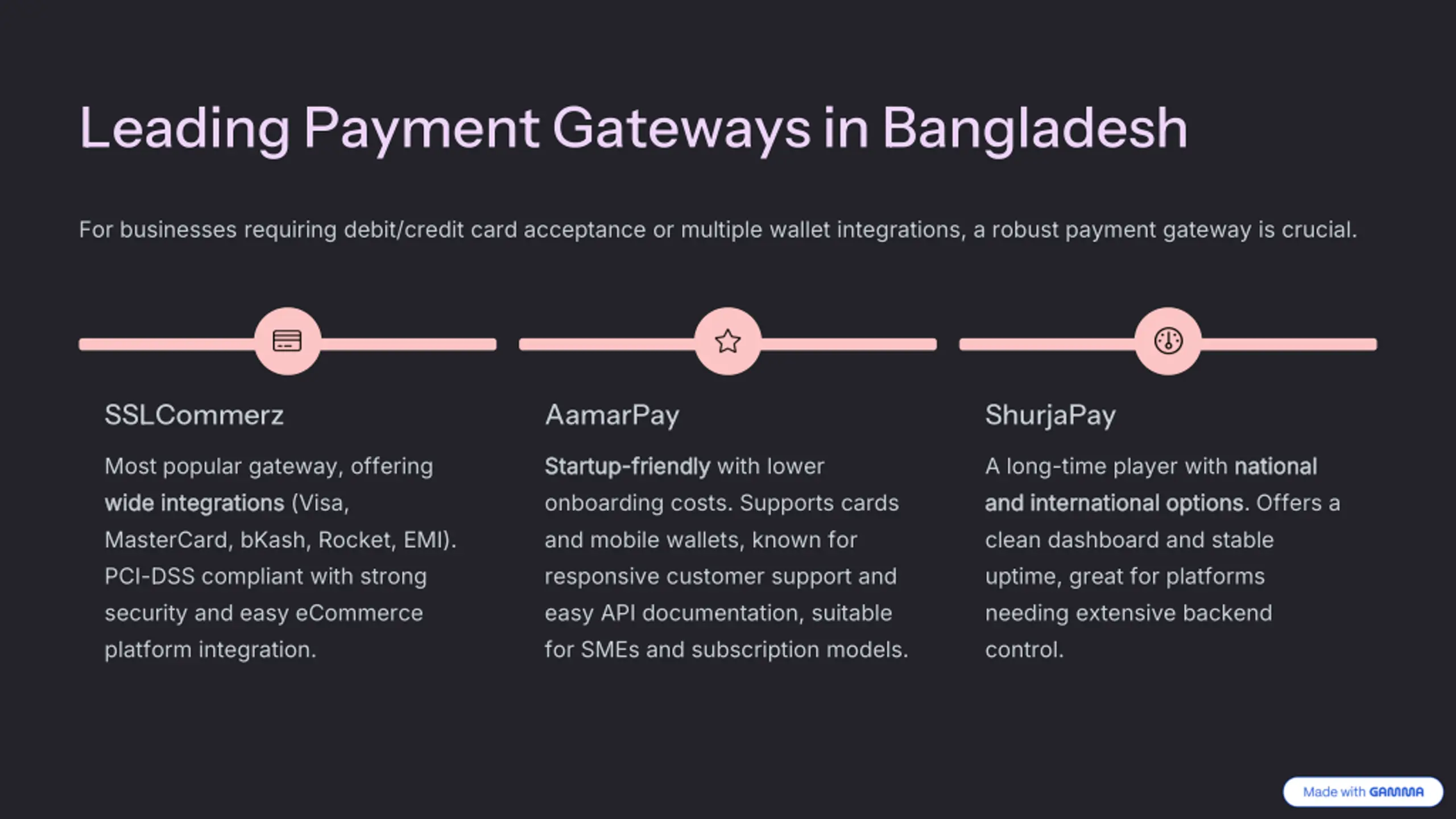 Leading Payment Gateways in Bangladesh For businesses requiring debit/credit card acceptance or multiple wallet integrations, a robust payment gateway is crucial. SSLCommerz AamarPay ShurjaPay Most popular gateway, offering wide integrations wide integrations (Visa, MasterCard, bKash, Rocket, EMI). PCI-DSS compliant with strong security and easy eCommerce platform integration. Startup Startup- -friendly onboarding costs. Supports cards and mobile wallets, known for responsive customer support and easy API documentation, suitable for SMEs and subscription models. friendly with lower A long-time player with national and international options and international options. Offers a clean dashboard and stable uptime, great for platforms needing extensive backend control. national preencoded.png