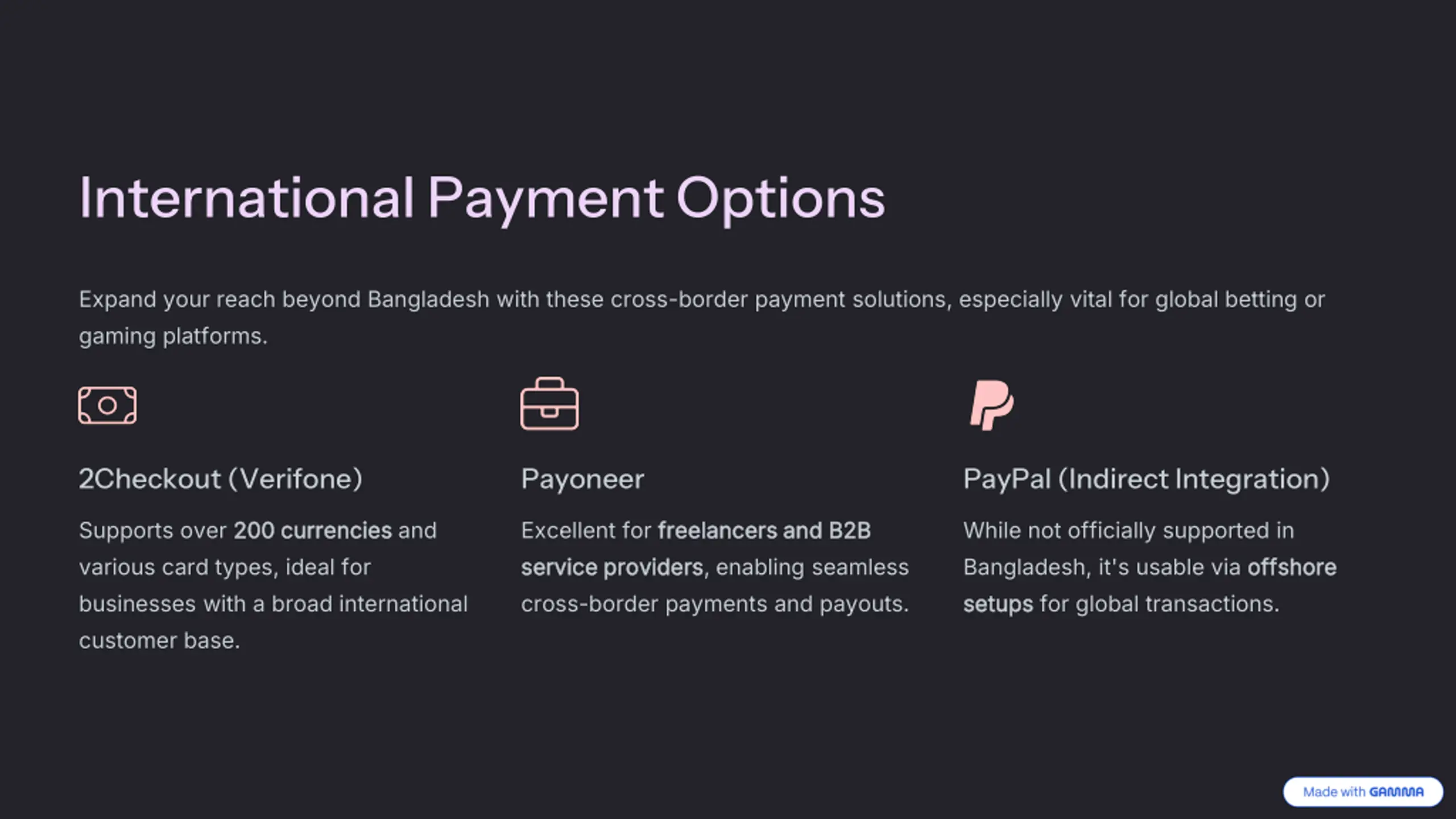 International Payment Options Expand your reach beyond Bangladesh with these cross-border payment solutions, especially vital for global betting or gaming platforms. 2Checkout (Verifone) Payoneer PayPal (Indirect Integration) Supports over 200 currencies 200 currencies and various card types, ideal for businesses with a broad international customer base. Excellent for freelancers and B2B freelancers and B2B service providers service providers, enabling seamless cross-border payments and payouts. While not officially supported in Bangladesh, it's usable via offshore setups setups for global transactions. offshore preencoded.png