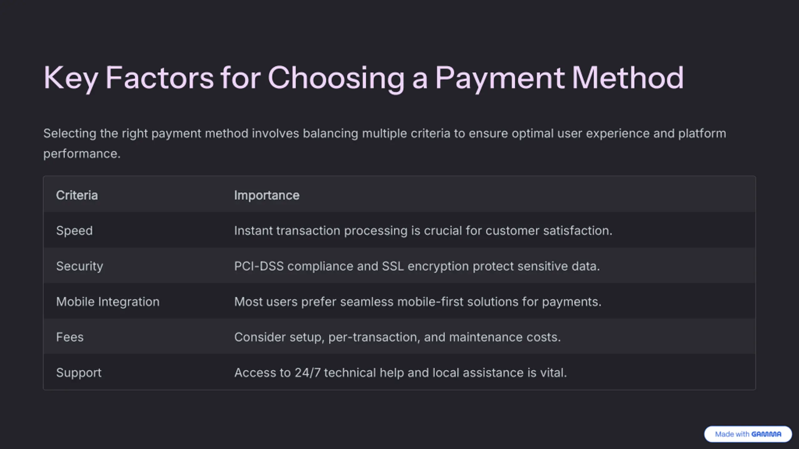 Key Factors for Choosing a Payment Method Selecting the right payment method involves balancing multiple criteria to ensure optimal user experience and platform performance. Criteria Criteria Importance Importance Speed Instant transaction processing is crucial for customer satisfaction. Security PCI-DSS compliance and SSL encryption protect sensitive data. Mobile Integration Most users prefer seamless mobile-first solutions for payments. Fees Consider setup, per-transaction, and maintenance costs. Support Access to 24/7 technical help and local assistance is vital. preencoded.png