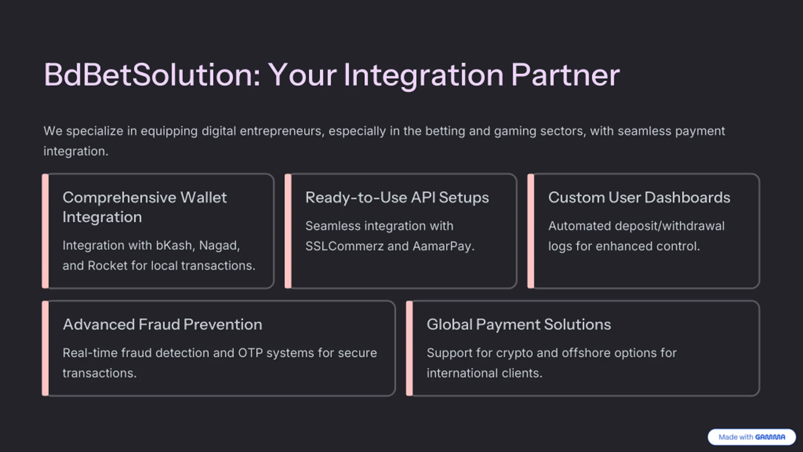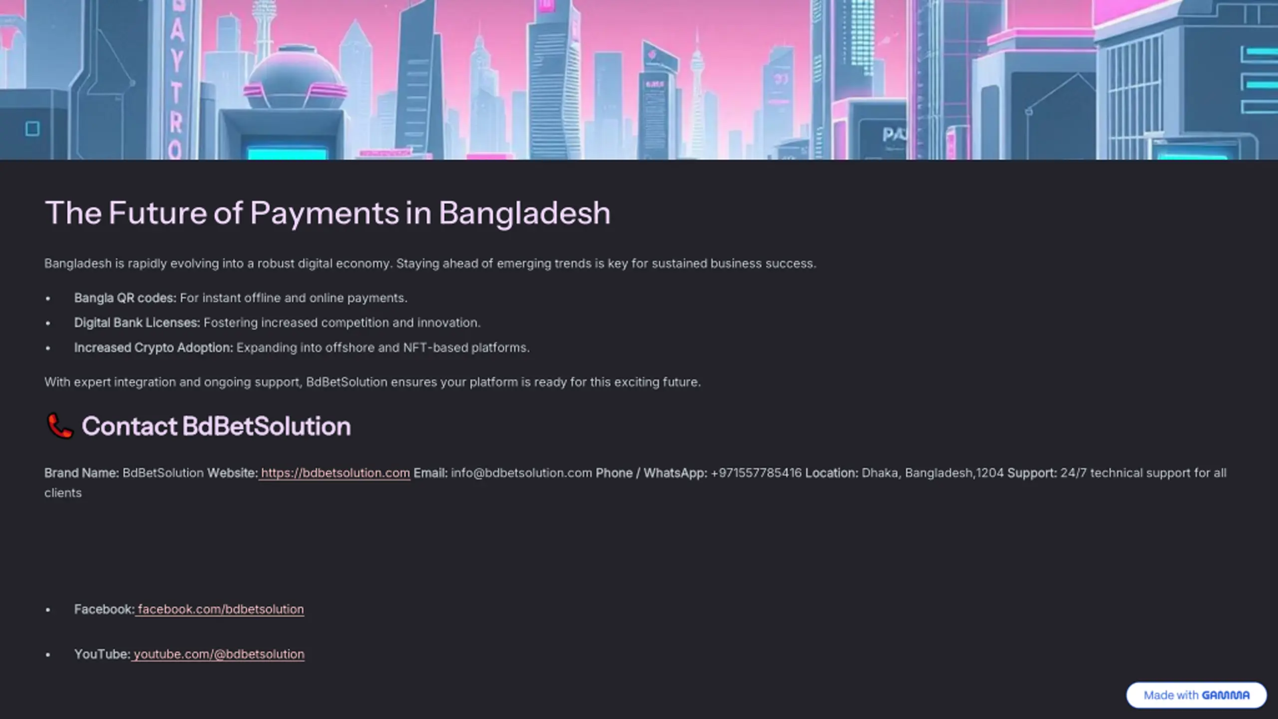 The Future of Payments in Bangladesh Bangladesh is rapidly evolving into a robust digital economy. Staying ahead of emerging trends is key for sustained business success. Bangla QR codes: Bangla QR codes: For instant offline and online payments. Digital Bank Licenses: Digital Bank Licenses: Fostering increased competition and innovation. Increased Crypto Adoption: Increased Crypto Adoption: Expanding into offshore and NFT-based platforms. With expert integration and ongoing support, BdBetSolution ensures your platform is ready for this exciting future. Contact BdBetSolution Contact BdBetSolution Brand Name: Brand Name: BdBetSolution Website: clients Website: https://bdbetsolution.com Email: Email: info@bdbetsolution.com Phone / WhatsApp: Phone / WhatsApp: +971557785416 Location: Location: Dhaka, Bangladesh,1204 Support: Support: 24/7 technical support for all Facebook: Facebook: facebook.com/bdbetsolution YouTube: YouTube: youtube.com/@bdbetsolution preencoded.png