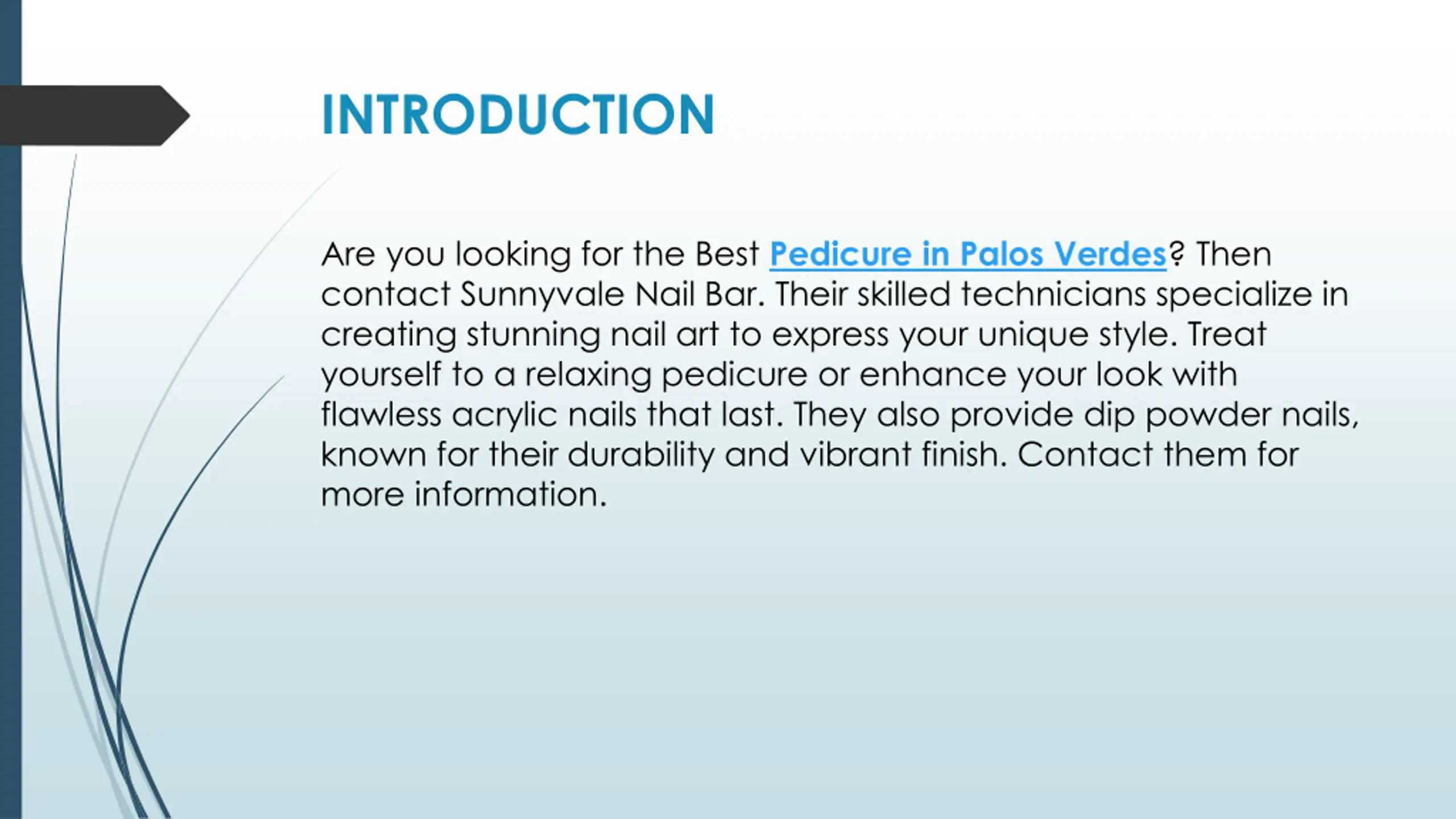 INTRODUCTION Are you looking for the Best Pedicure in Palos Verdes? Then contact Sunnyvale Nail Bar. Their skilled technicians specialize in creating stunning nail art to express your unique style. Treat yourself to a relaxing pedicure or enhance your look with flawless acrylic nails that last. They also provide dip powder nails, known for their durability and vibrant finish. Contact them for more information.