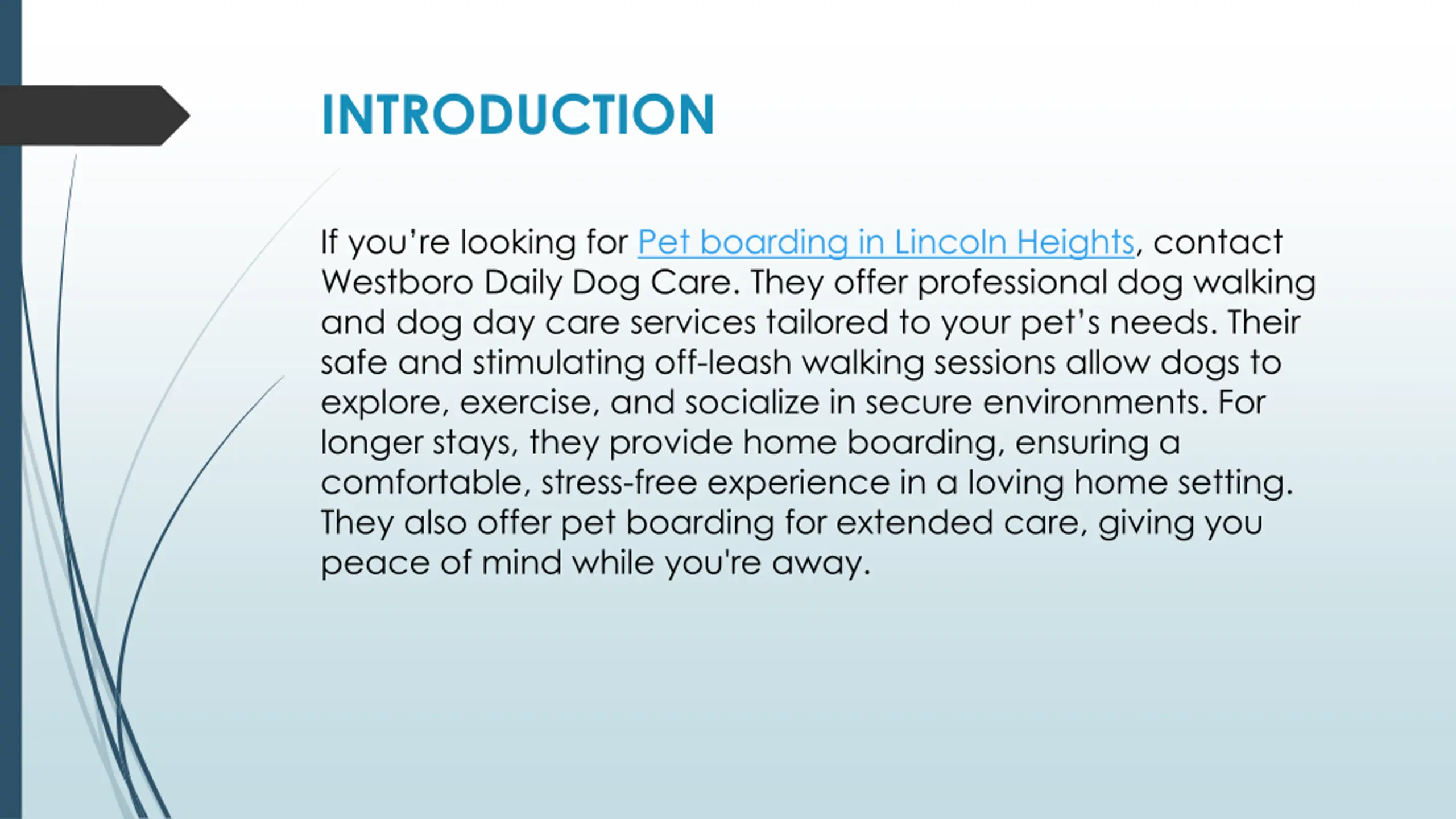 INTRODUCTION If you re looking for Pet boarding in Lincoln Heights, contact Westboro Daily Dog Care. They offer professional dog walking and dog day care services tailored to your pet s needs. Their safe and stimulating off-leash walking sessions allow dogs to explore, exercise, and socialize in secure environments. For longer stays, they provide home boarding, ensuring a comfortable, stress-free experience in a loving home setting. They also offer pet boarding for extended care, giving you peace of mind while you're away.