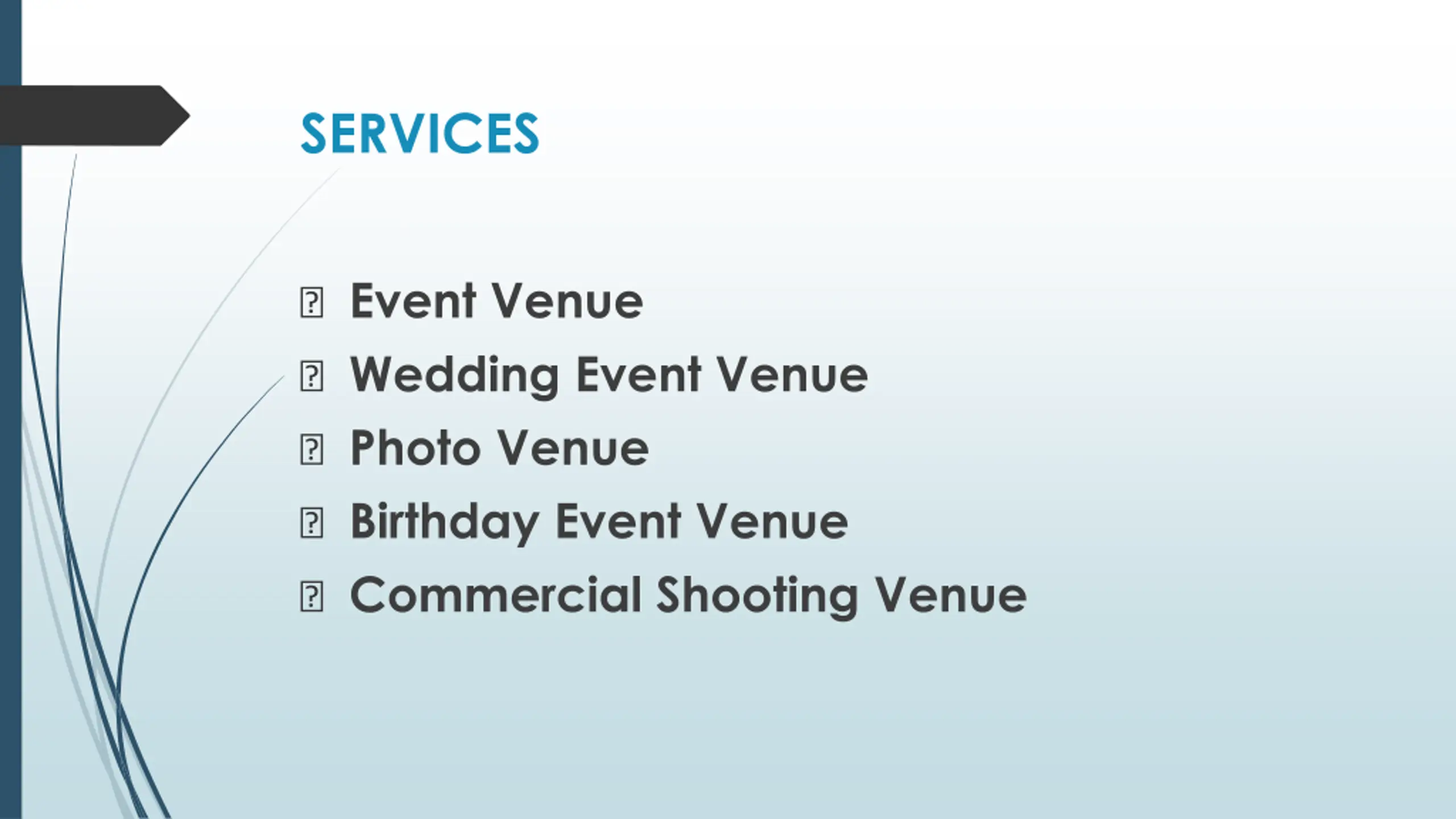 SERVICES ? Event Venue ? Wedding Event Venue ? Photo Venue ? Birthday Event Venue ? Commercial Shooting Venue