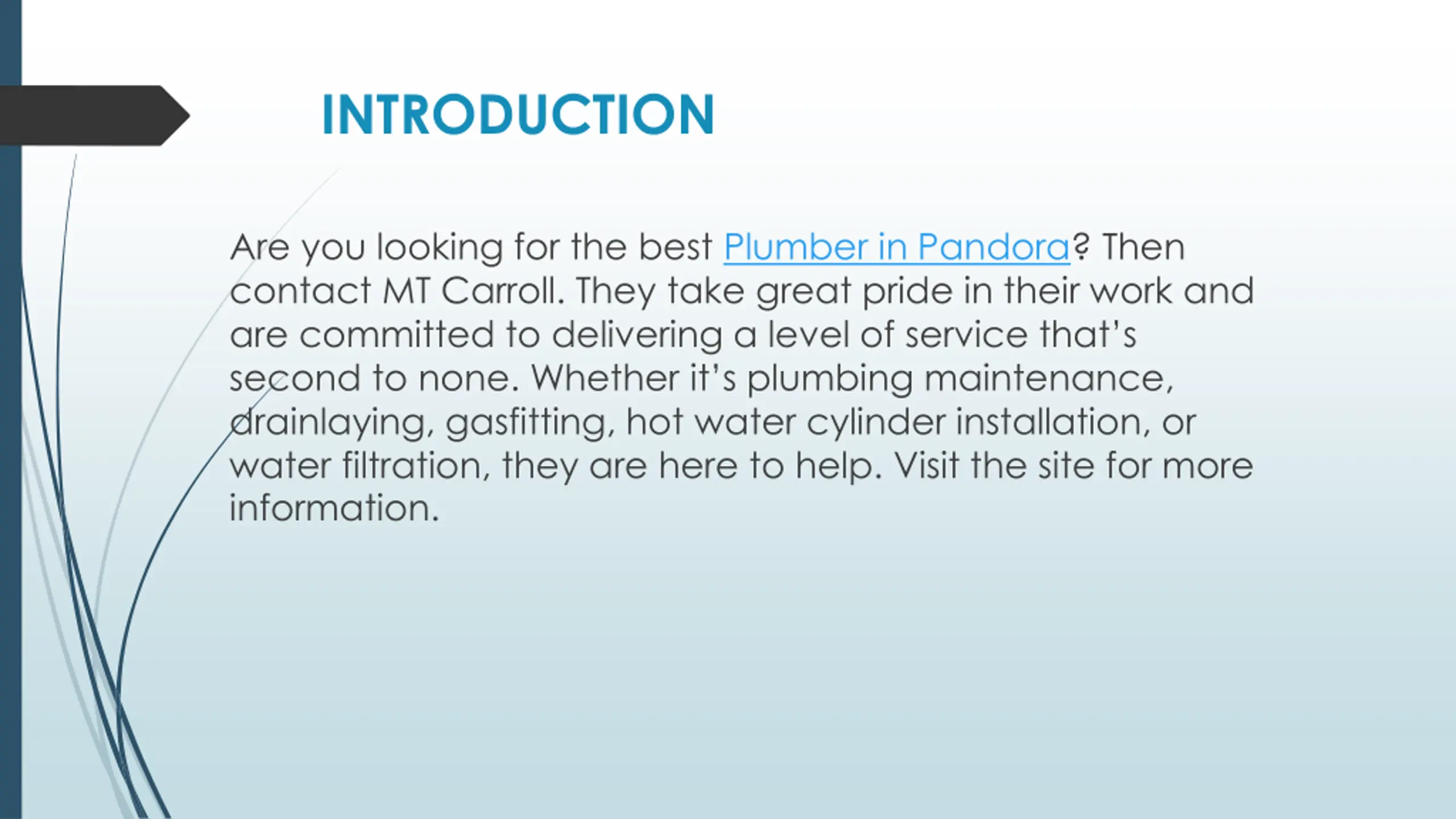 INTRODUCTION Are you looking for the best Plumber in Pandora? Then contact MT Carroll. They take great pride in their work and are committed to delivering a level of service that s second to none. Whether it s plumbing maintenance, drainlaying, gasfitting, hot water cylinder installation, or water filtration, they are here to help. Visit the site for more information.