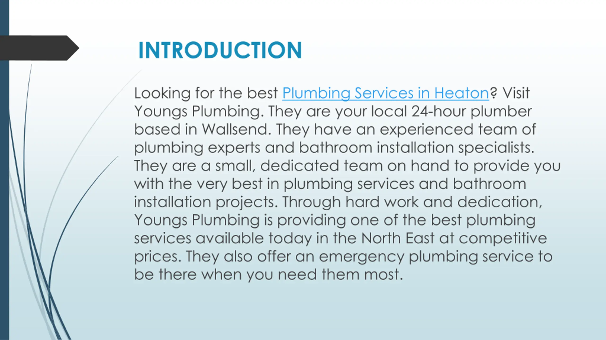 INTRODUCTION Looking for the best Plumbing Services in Heaton? Visit Youngs Plumbing. They are your local 24-hour plumber based in Wallsend. They have an experienced team of plumbing experts and bathroom installation specialists. They are a small, dedicated team on hand to provide you with the very best in plumbing services and bathroom installation projects. Through hard work and dedication, Youngs Plumbing is providing one of the best plumbing services available today in the North East at competitive prices. They also offer an emergency plumbing service to be there when you need them most.