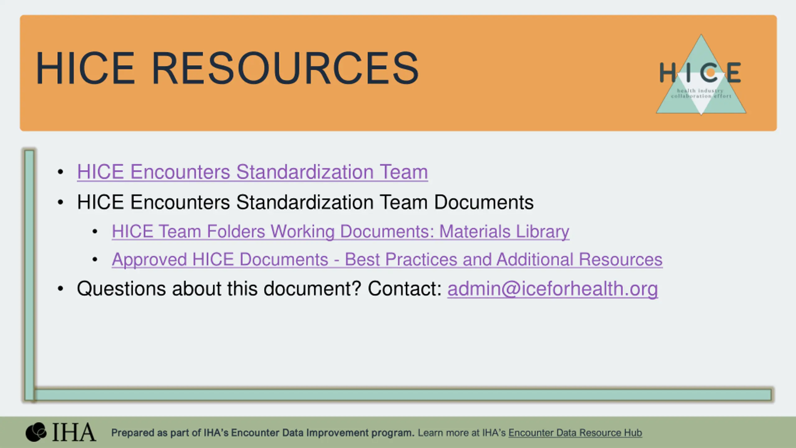 HICE RESOURCES HICE Encounters Standardization Team HICE Encounters Standardization Team Documents HICE Team Folders Working Documents: Materials Library Approved HICE Documents - Best Practices and Additional Resources Questions about this document? Contact: admin@iceforhealth.org 15 Prepared as part of IHA s Encounter Data Improvement program. Prepared as part of IHA s Encounter Data Improvement program. Learn more at IHA s Encounter Data Resource Hub
