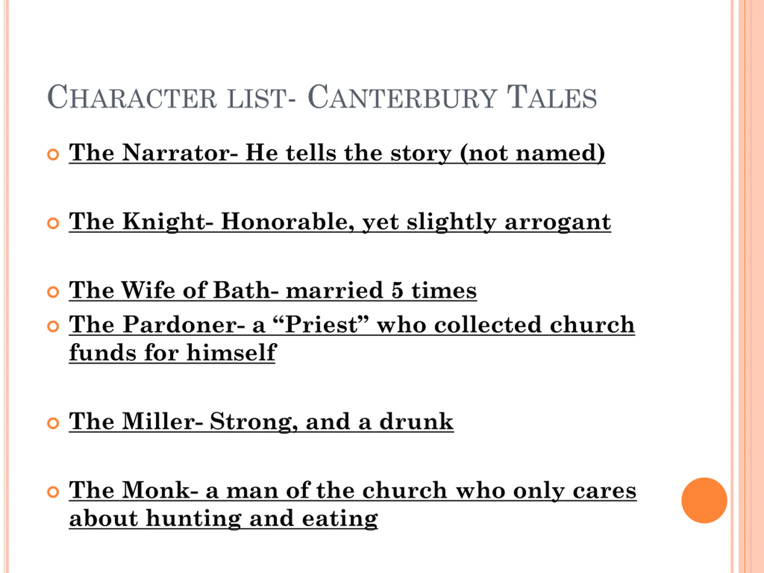 CHARACTER LIST- CANTERBURY TALES The Narrator- He tells the story (not named) The Knight- Honorable, yet slightly arrogant The Wife of Bath- married 5 times The Pardoner- a Priest who collected church funds for himself The Miller- Strong, and a drunk The Monk- a man of the church who only cares about hunting and eating