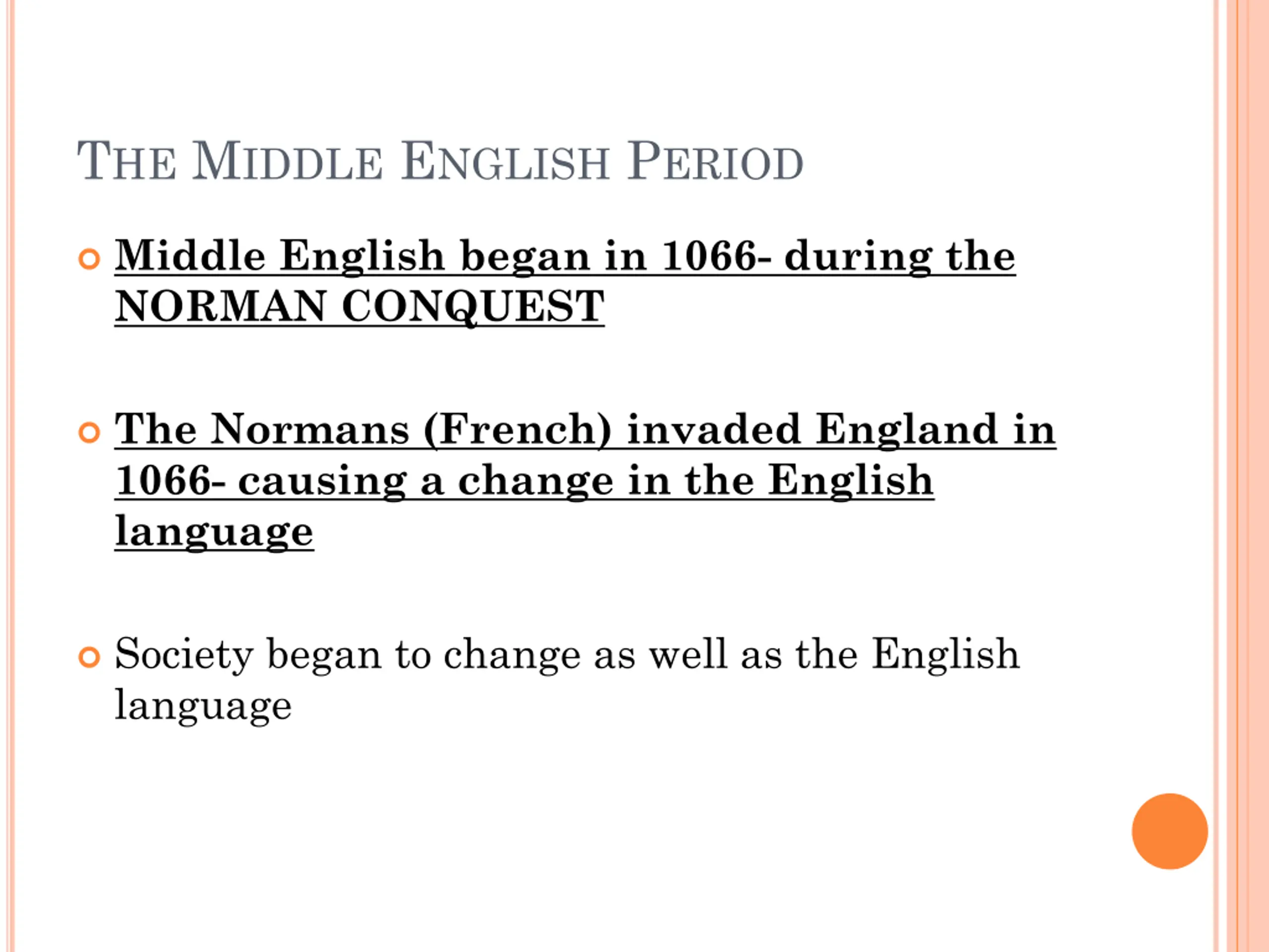 THE MIDDLE ENGLISH PERIOD Middle English began in 1066- during the NORMAN CONQUEST The Normans (French) invaded England in 1066- causing a change in the English language Society began to change as well as the English language