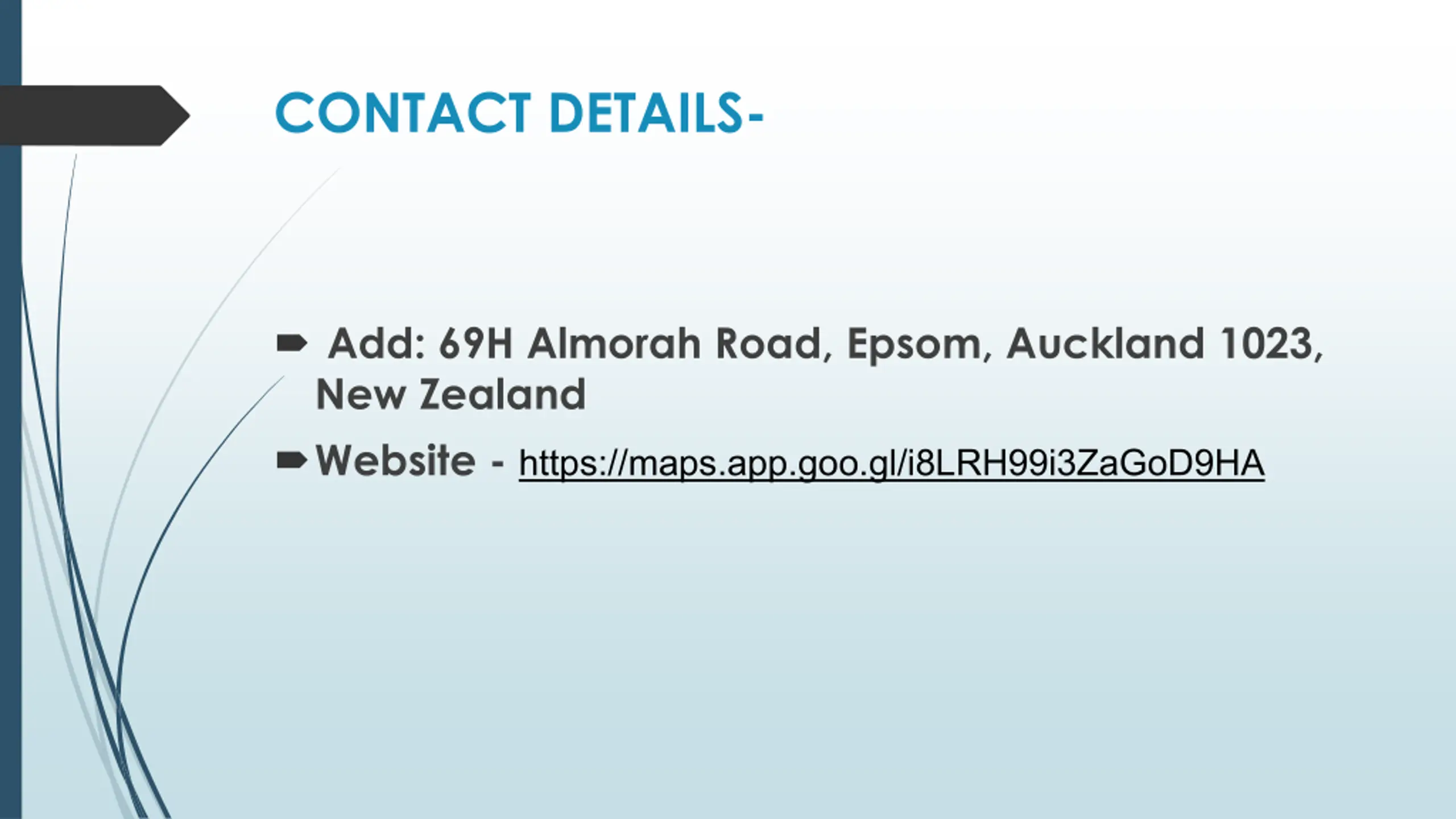 5. CONTACT DETAILS- Add: 69H Almorah Road, Epsom, Auckland 1023, New Zealand Website - https://maps.app.goo.gl/i8LRH99i3ZaGoD9HA