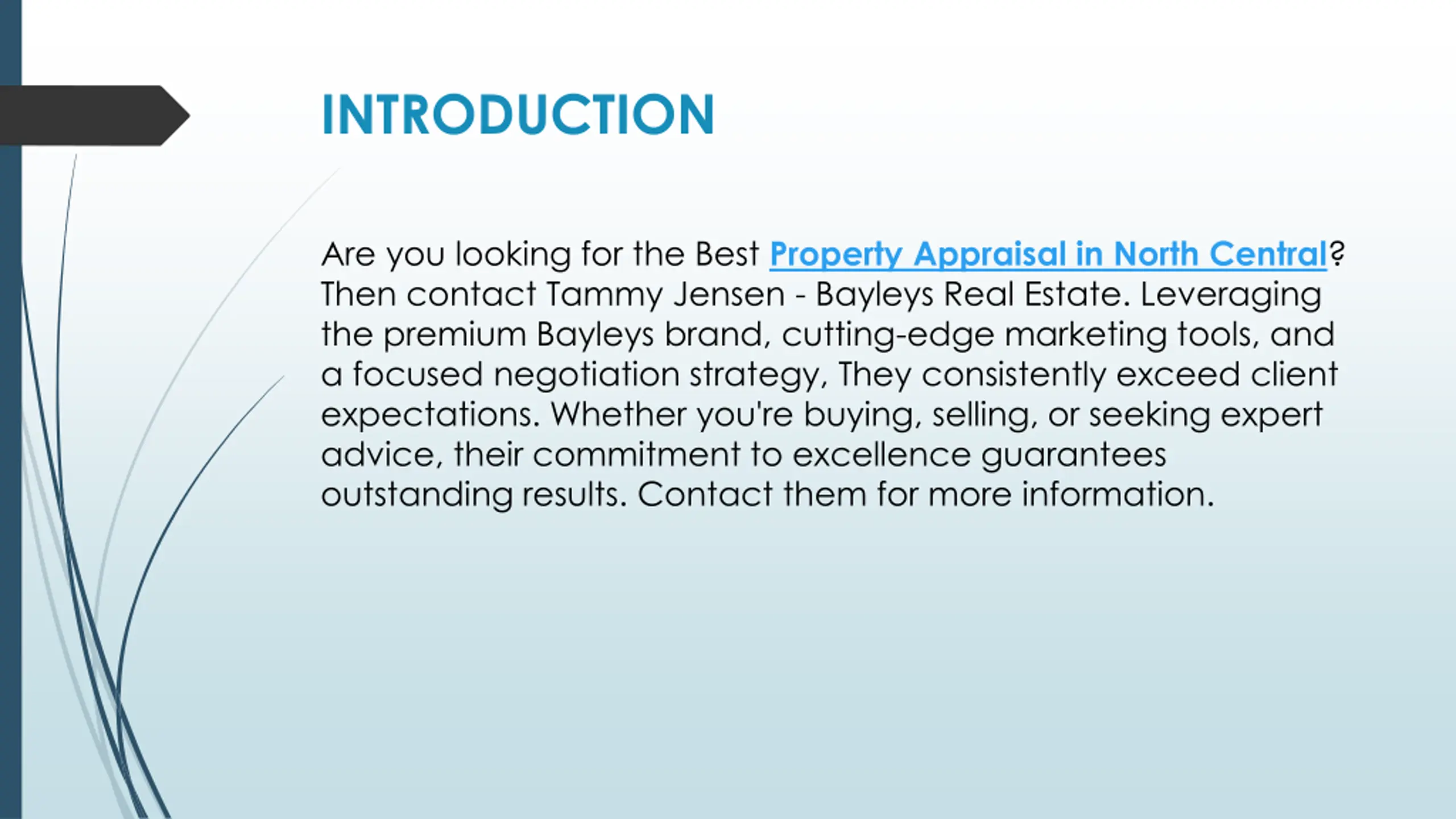 INTRODUCTION Are you looking for the Best Property Appraisal in North Central? Then contact Tammy Jensen - Bayleys Real Estate. Leveraging the premium Bayleys brand, cutting-edge marketing tools, and a focused negotiation strategy, They consistently exceed client expectations. Whether you're buying, selling, or seeking expert advice, their commitment to excellence guarantees outstanding results. Contact them for more information.