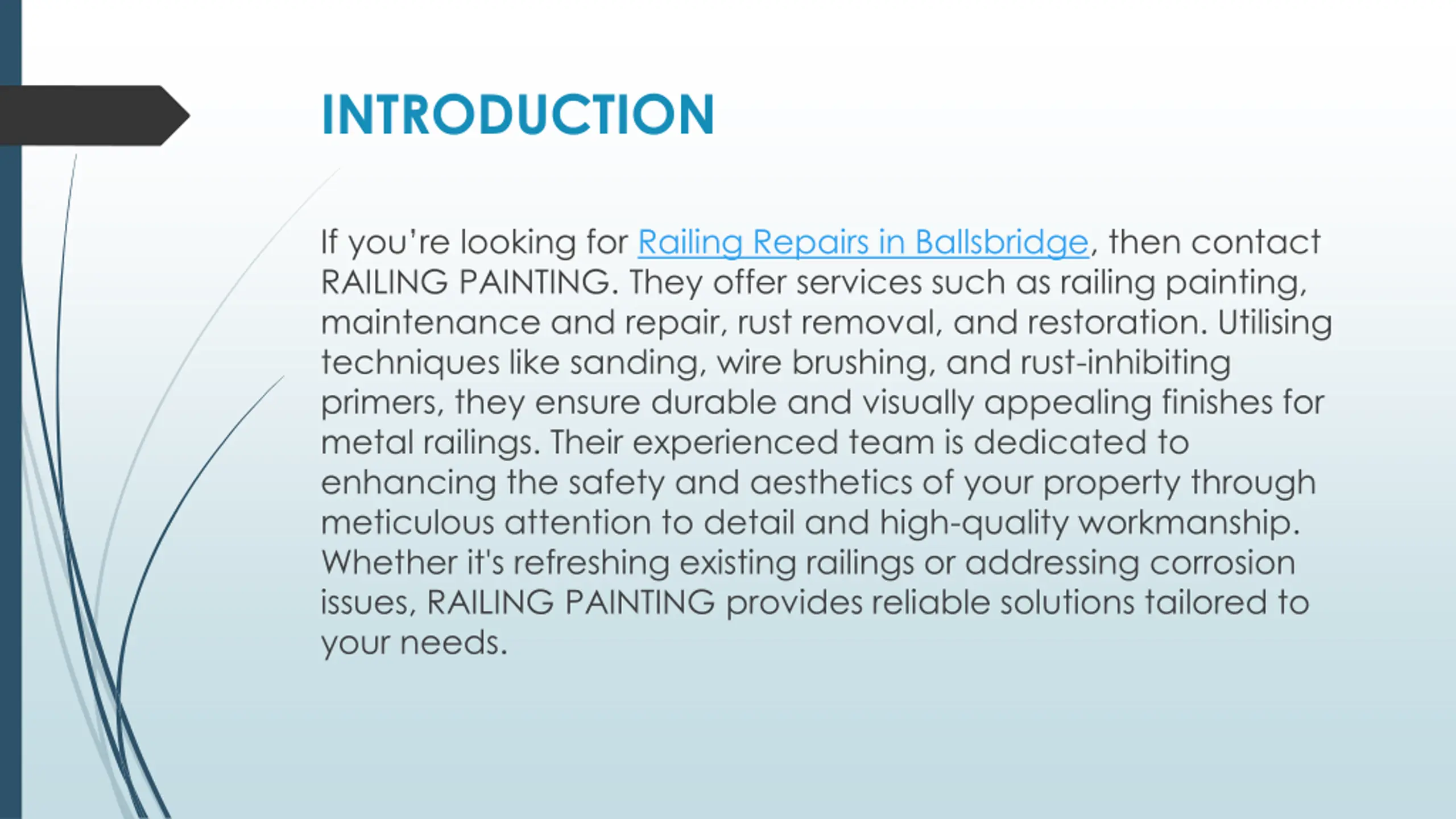INTRODUCTION If you re looking for Railing Repairs in Ballsbridge, then contact RAILING PAINTING. They offer services such as railing painting, maintenance and repair, rust removal, and restoration. Utilising techniques like sanding, wire brushing, and rust-inhibiting primers, they ensure durable and visually appealing finishes for metal railings. Their experienced team is dedicated to enhancing the safety and aesthetics of your property through meticulous attention to detail and high-quality workmanship. Whether it's refreshing existing railings or addressing corrosion issues, RAILING PAINTING provides reliable solutions tailored to your needs.