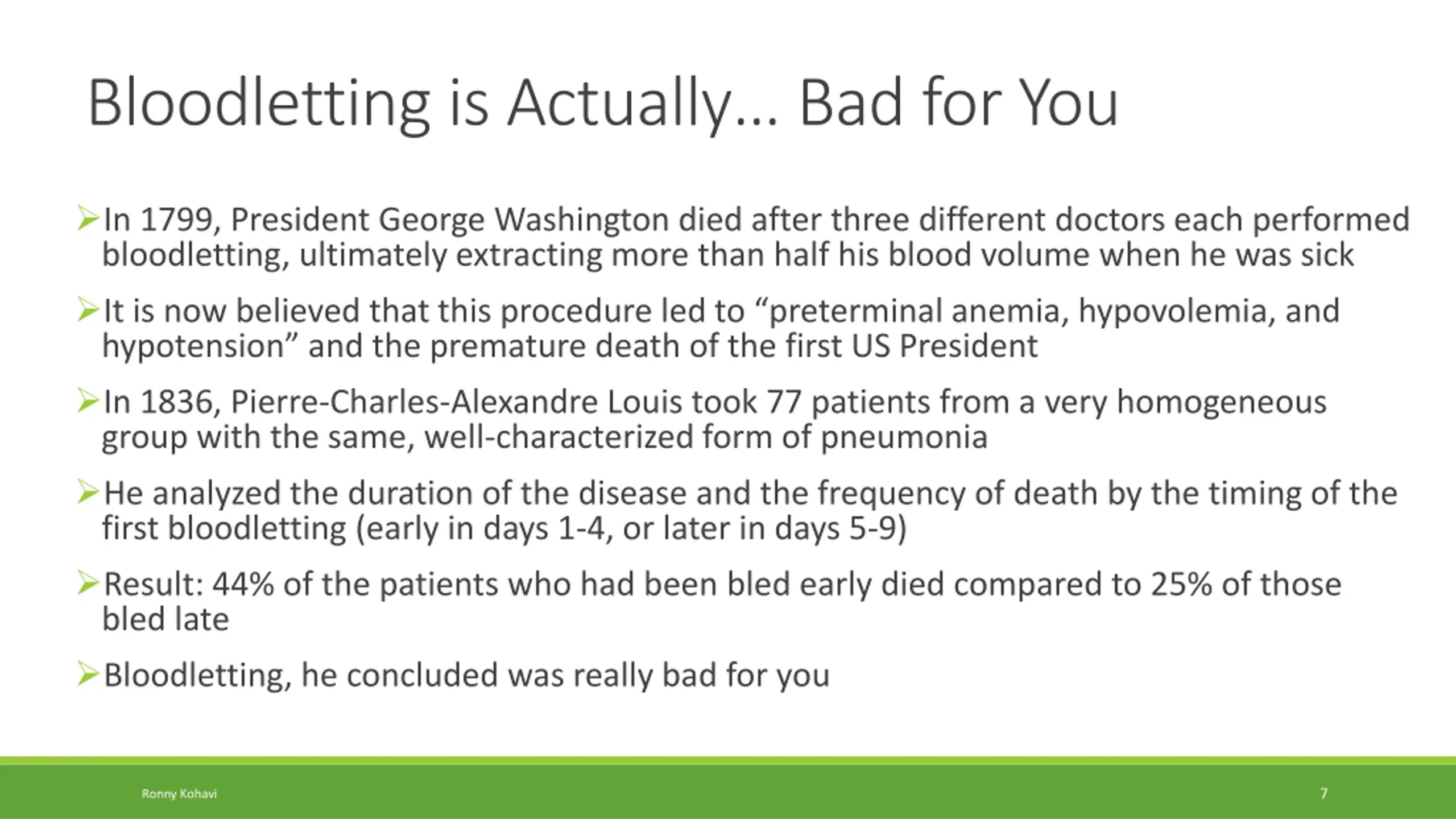 Bloodletting is Actually Bad for You In 1799, President George Washington died after three different doctors each performed bloodletting, ultimately extracting more than half his blood volume when he was sick It is now believed that this procedure led to preterminal anemia, hypovolemia, and hypotension and the premature death of the first US President In 1836, Pierre-Charles-Alexandre Louis took 77 patients from a very homogeneous group with the same, well-characterized form of pneumonia He analyzed the duration of the disease and the frequency of death by the timing of the first bloodletting (early in days 1-4, or later in days 5-9) Result: 44% of the patients who had been bled early died compared to 25% of those bled late Bloodletting, he concluded was really bad for you 7 Ronny Kohavi