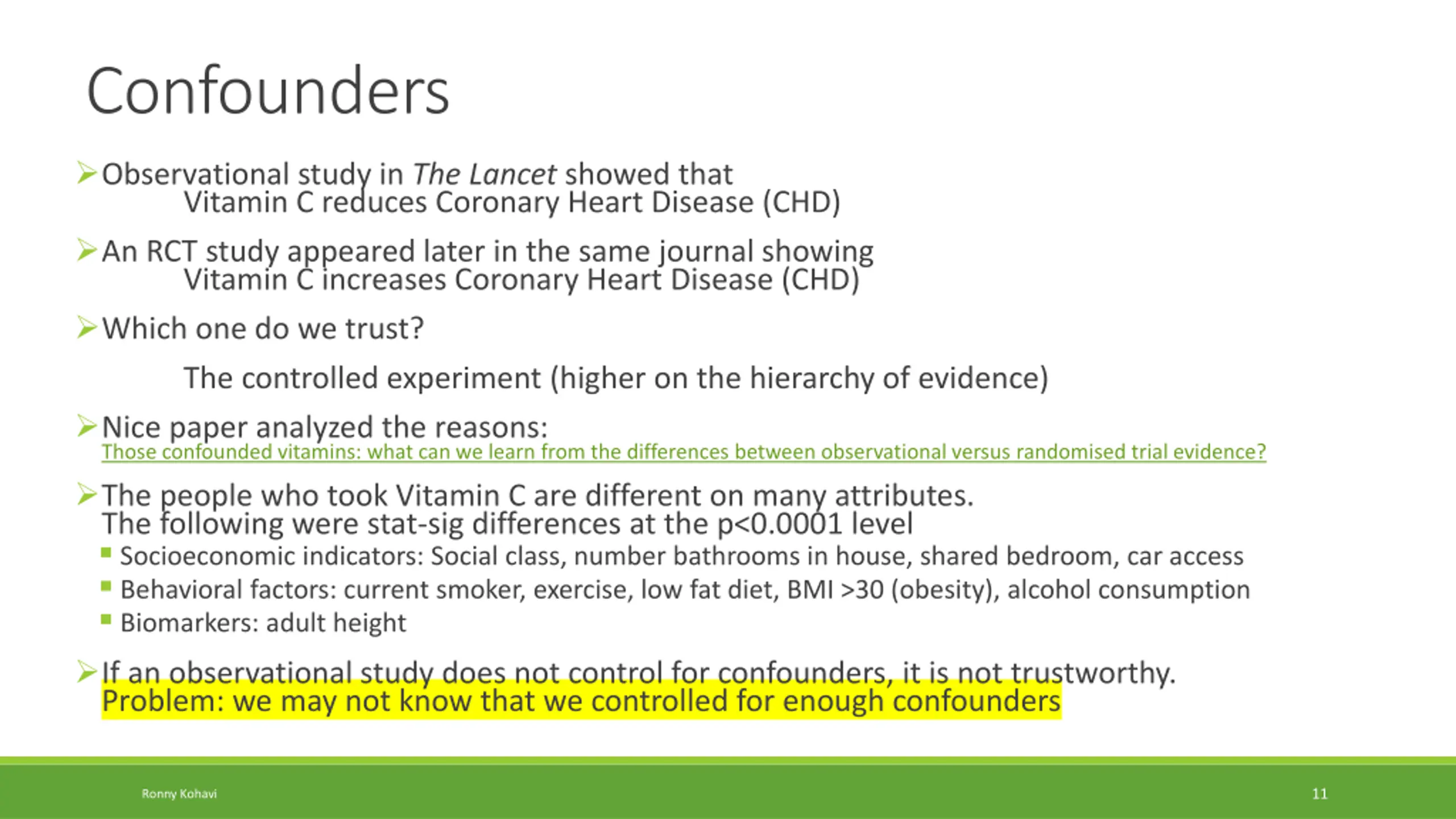 Confounders Observational study in The Lancet showed that Vitamin C reduces Coronary Heart Disease (CHD) An RCT study appeared later in the same journal showing Vitamin C increases Coronary Heart Disease (CHD) Which one do we trust? The controlled experiment (higher on the hierarchy of evidence) Nice paper analyzed the reasons: Those confounded vitamins: what can we learn from the differences between observational versus randomised trial evidence? The people who took Vitamin C are different on many attributes. The following were stat-sig differences at the p<0.0001 level Socioeconomic indicators: Social class, number bathrooms in house, shared bedroom, car access Behavioral factors: current smoker, exercise, low fat diet, BMI >30 (obesity), alcohol consumption Biomarkers: adult height If an observational study does not control for confounders, it is not trustworthy. Problem: we may not know that we controlled for enough confounders 11 Ronny Kohavi