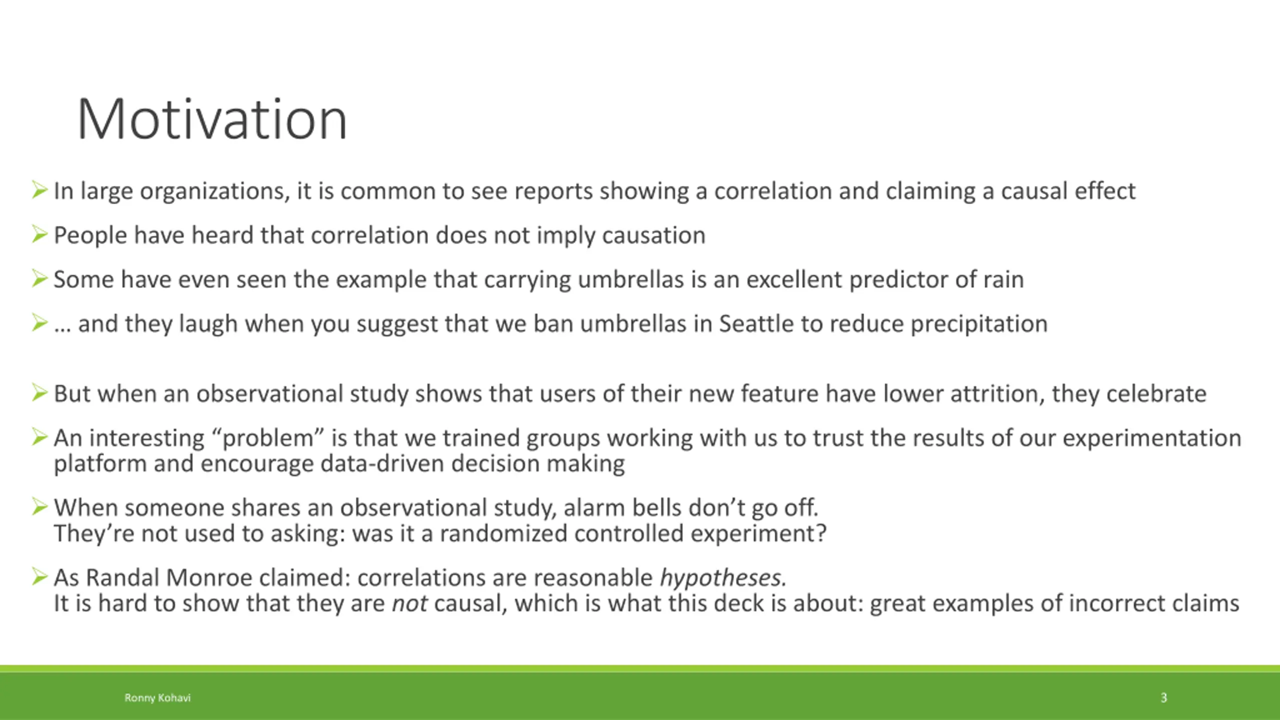 Motivation In large organizations, it is common to see reports showing a correlation and claiming a causal effect People have heard that correlation does not imply causation Some have even seen the example that carrying umbrellas is an excellent predictor of rain and they laugh when you suggest that we ban umbrellas in Seattle to reduce precipitation But when an observational study shows that users of their new feature have lower attrition, they celebrate An interesting problem is that we trained groups working with us to trust the results of our experimentation platform and encourage data-driven decision making When someone shares an observational study, alarm bells don t go off. They re not used to asking: was it a randomized controlled experiment? As Randal Monroe claimed: correlations are reasonable hypotheses. It is hard to show that they are not causal, which is what this deck is about: great examples of incorrect claims 3 Ronny Kohavi