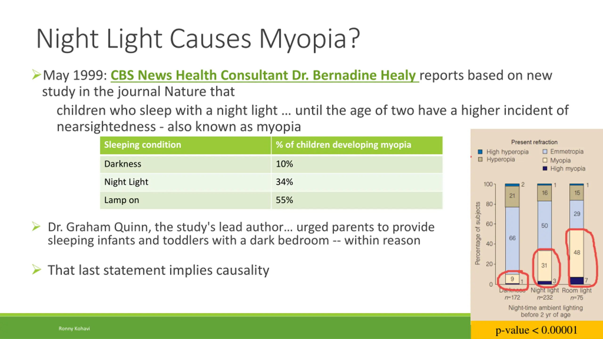 Night Light Causes Myopia? May 1999: CBS News Health Consultant Dr. Bernadine Healy reports based on new study in the journal Nature that children who sleep with a night light until the age of two have a higher incident of nearsightedness - also known as myopia Sleeping condition % of children developing myopia Darkness 10% Night Light 34% Lamp on 55% Dr. Graham Quinn, the study's lead author urged parents to provide sleeping infants and toddlers with a dark bedroom -- within reason That last statement implies causality p-value < 0.00001 9 Ronny Kohavi