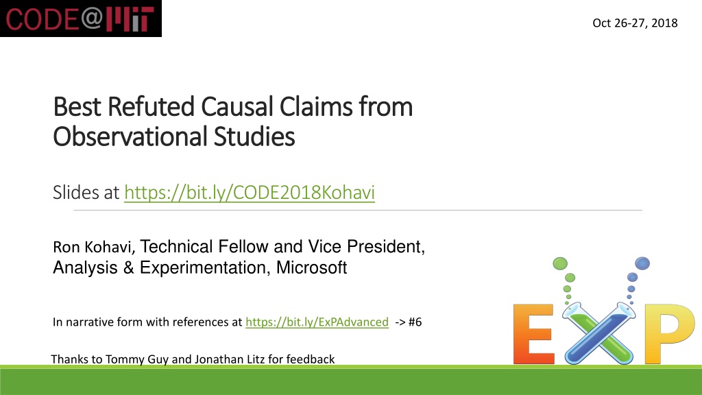 Oct 26-27, 2018 Best Refuted Causal Claims from Best Refuted Causal Claims from Observational Studies Observational Studies Slides at https://bit.ly/CODE2018Kohavi Ron Kohavi, Technical Fellow and Vice President, Analysis & Experimentation, Microsoft In narrative form with references at https://bit.ly/ExPAdvanced -> #6 Thanks to Tommy Guy and Jonathan Litz for feedback