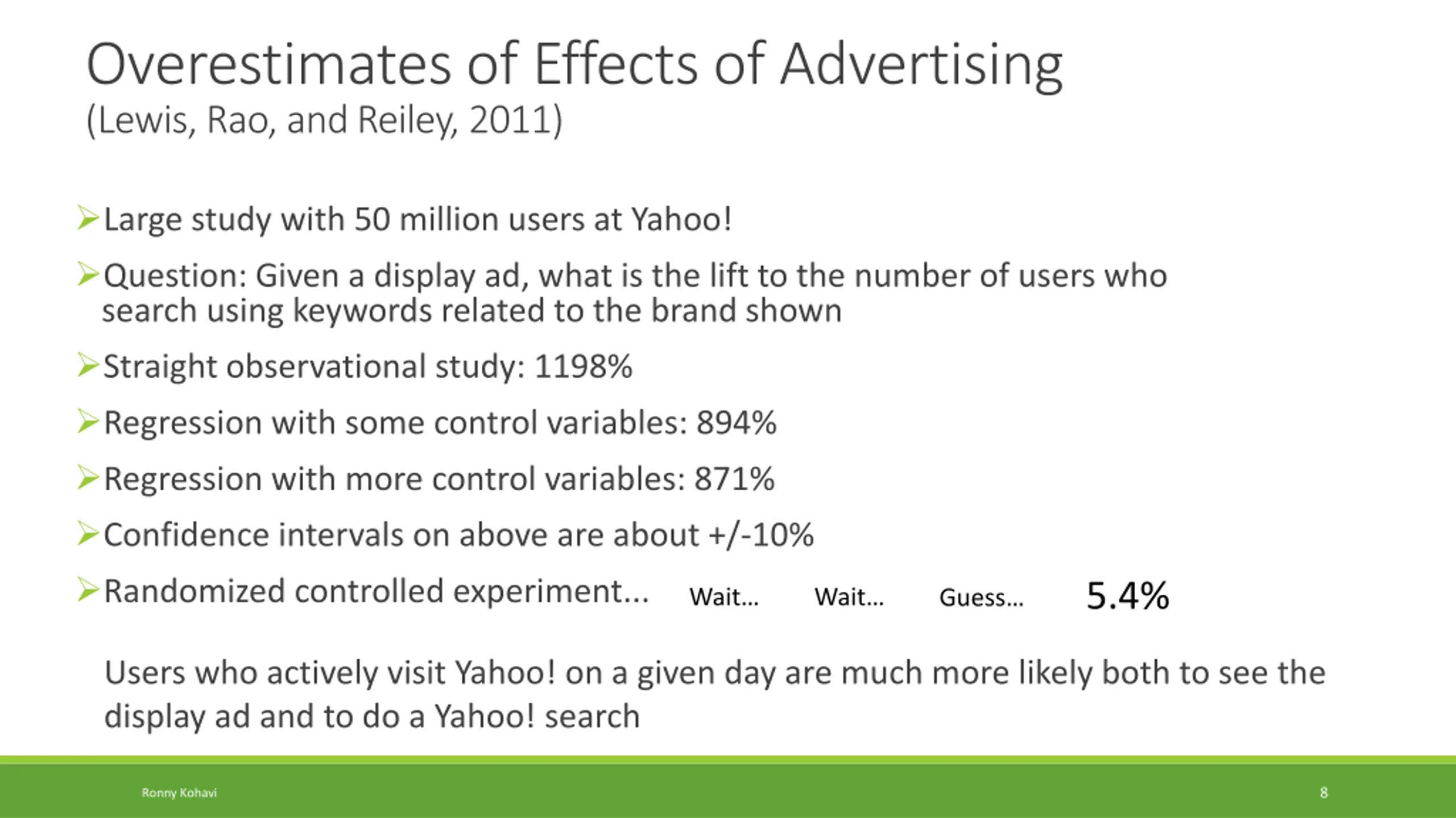 Overestimates of Effects of Advertising (Lewis, Rao, and Reiley, 2011) Large study with 50 million users at Yahoo! Question: Given a display ad, what is the lift to the number of users who search using keywords related to the brand shown Straight observational study: 1198% Regression with some control variables: 894% Regression with more control variables: 871% Confidence intervals on above are about +/-10% Randomized controlled experiment... 5.4% Wait Wait Guess Users who actively visit Yahoo! on a given day are much more likely both to see the display ad and to do a Yahoo! search 8 Ronny Kohavi