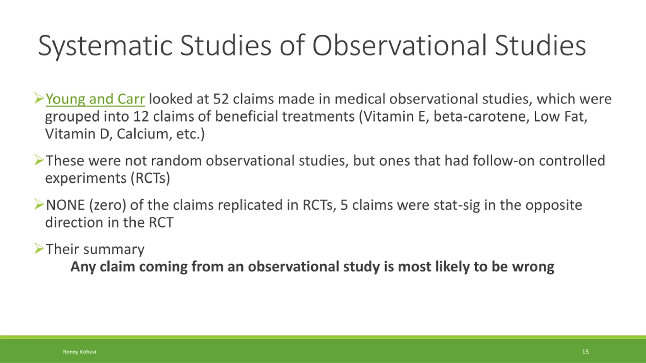 Systematic Studies of Observational Studies Young and Carr looked at 52 claims made in medical observational studies, which were grouped into 12 claims of beneficial treatments (Vitamin E, beta-carotene, Low Fat, Vitamin D, Calcium, etc.) These were not random observational studies, but ones that had follow-on controlled experiments (RCTs) NONE (zero) of the claims replicated in RCTs, 5 claims were stat-sig in the opposite direction in the RCT Their summary Any claim coming from an observational study is most likely to be wrong 15 Ronny Kohavi