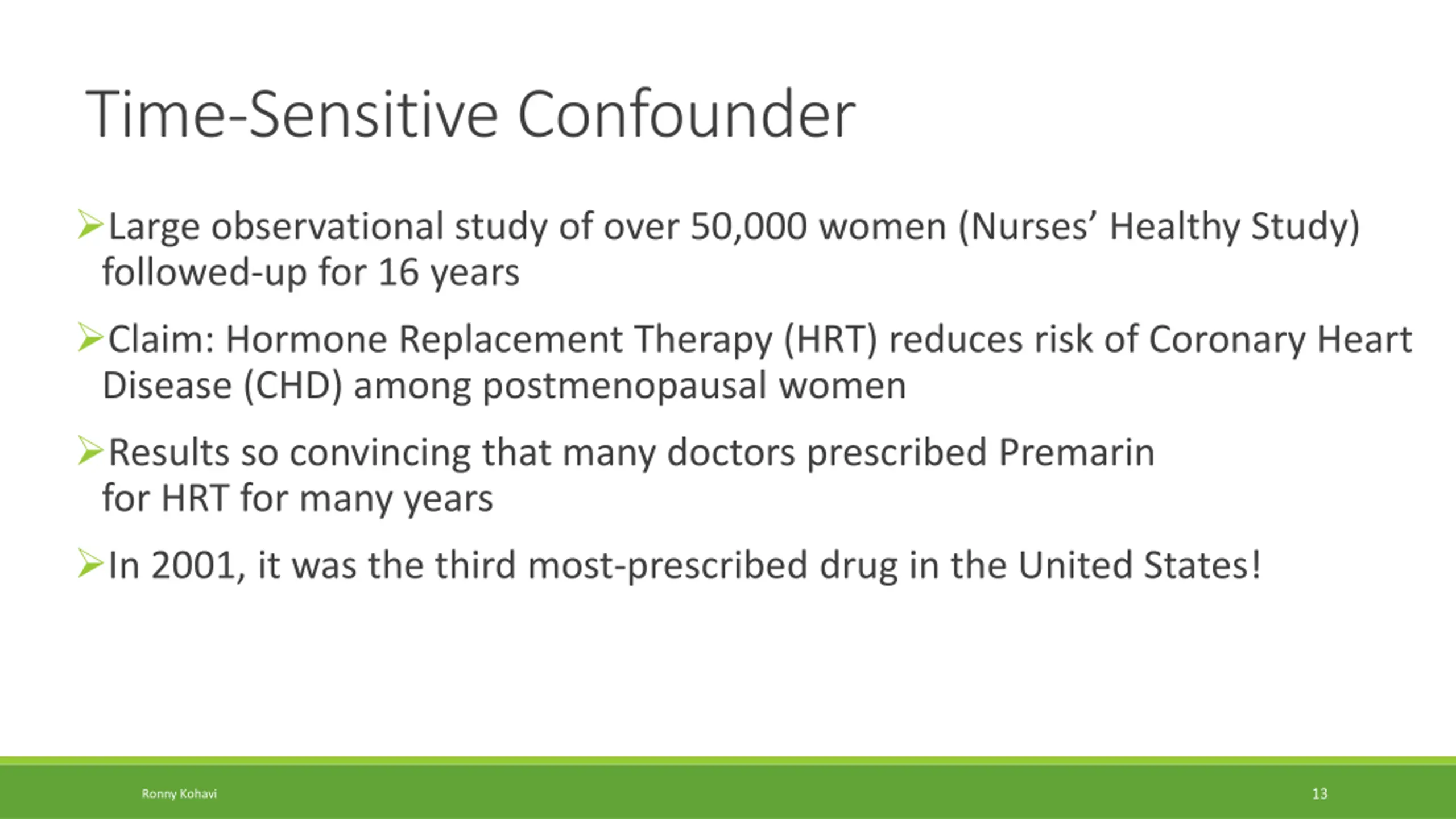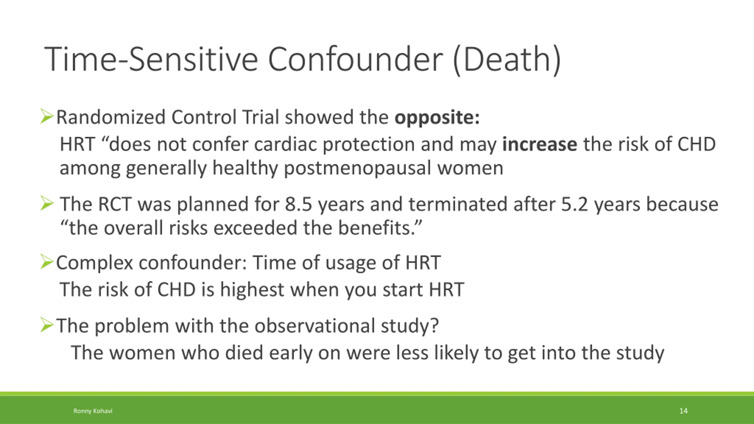 Time-Sensitive Confounder Large observational study of over 50,000 women (Nurses Healthy Study) followed-up for 16 years Claim: Hormone Replacement Therapy (HRT) reduces risk of Coronary Heart Disease (CHD) among postmenopausal women Results so convincing that many doctors prescribed Premarin for HRT for many years In 2001, it was the third most-prescribed drug in the United States! 13 Ronny Kohavi