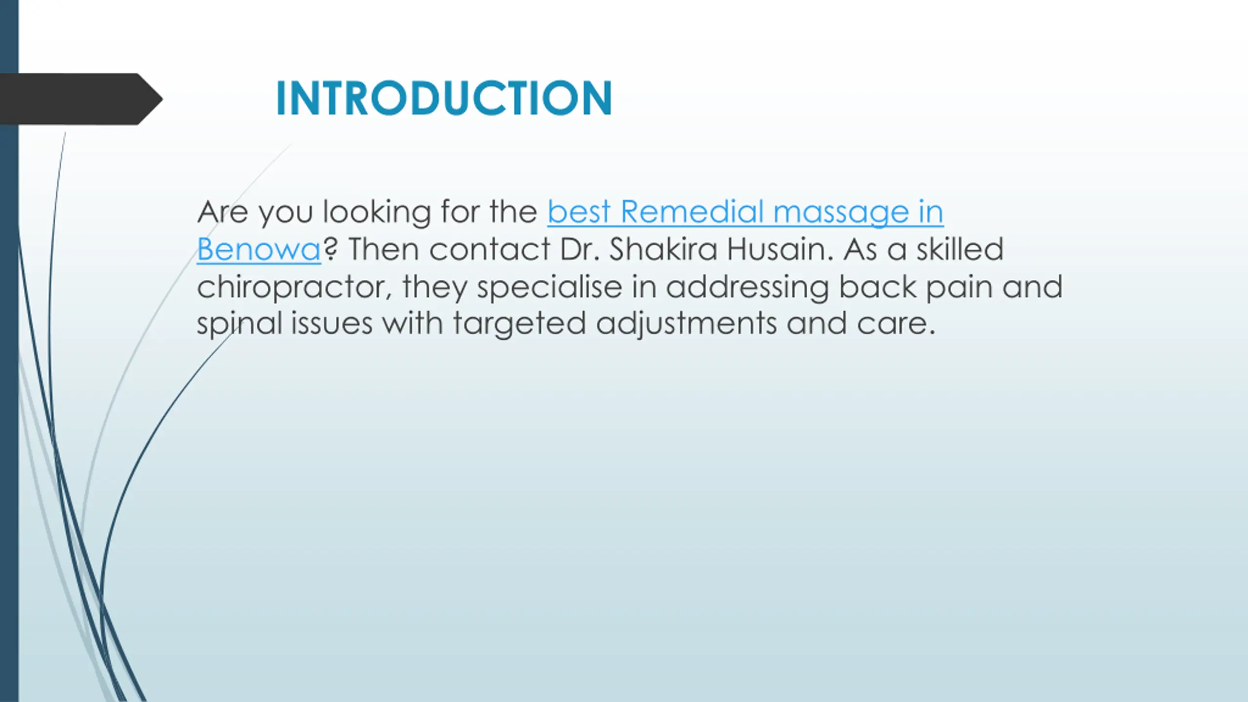 INTRODUCTION Are you looking for the best Remedial massage in Benowa? Then contact Dr. Shakira Husain. As a skilled chiropractor, they specialise in addressing back pain and spinal issues with targeted adjustments and care.