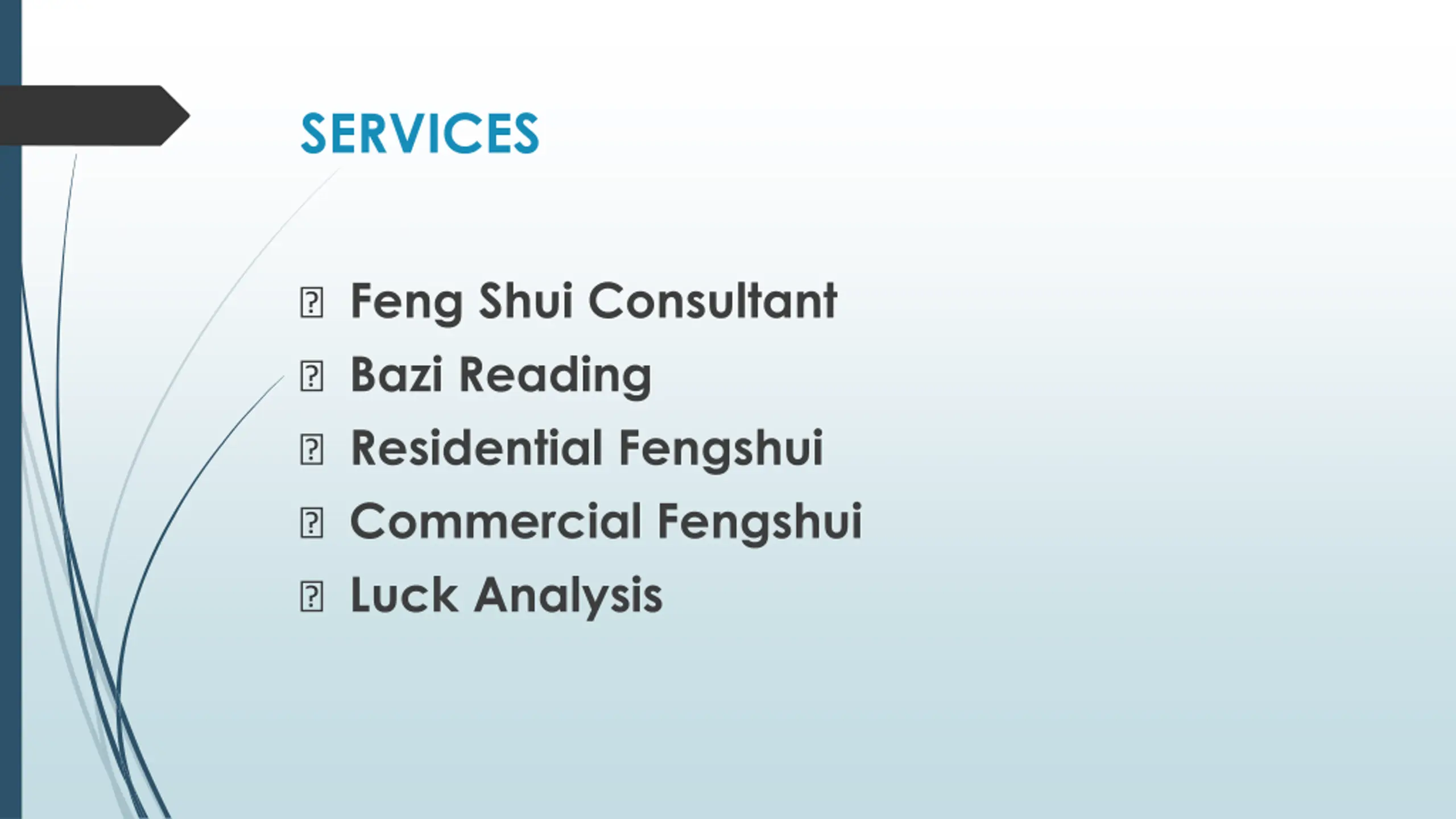 SERVICES ? Feng Shui Consultant ? Bazi Reading ? Residential Fengshui ? Commercial Fengshui ? Luck Analysis