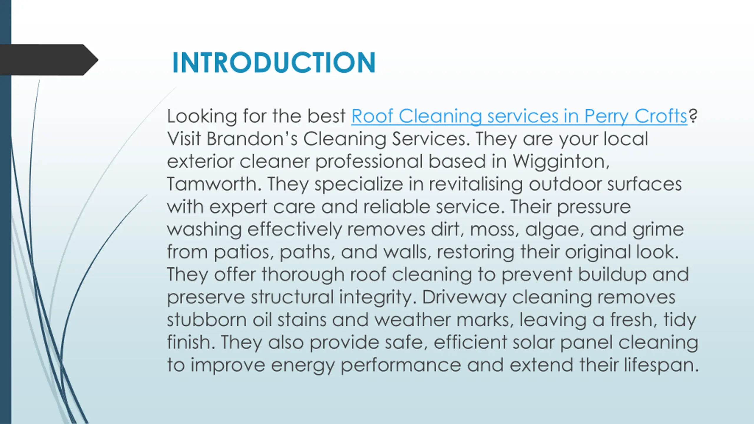 INTRODUCTION Looking for the best Roof Cleaning services in Perry Crofts? Visit Brandon s Cleaning Services. They are your local exterior cleaner professional based in Wigginton, Tamworth. They specialize in revitalising outdoor surfaces with expert care and reliable service. Their pressure washing effectively removes dirt, moss, algae, and grime from patios, paths, and walls, restoring their original look. They offer thorough roof cleaning to prevent buildup and preserve structural integrity. Driveway cleaning removes stubborn oil stains and weather marks, leaving a fresh, tidy finish. They also provide safe, efficient solar panel cleaning to improve energy performance and extend their lifespan.