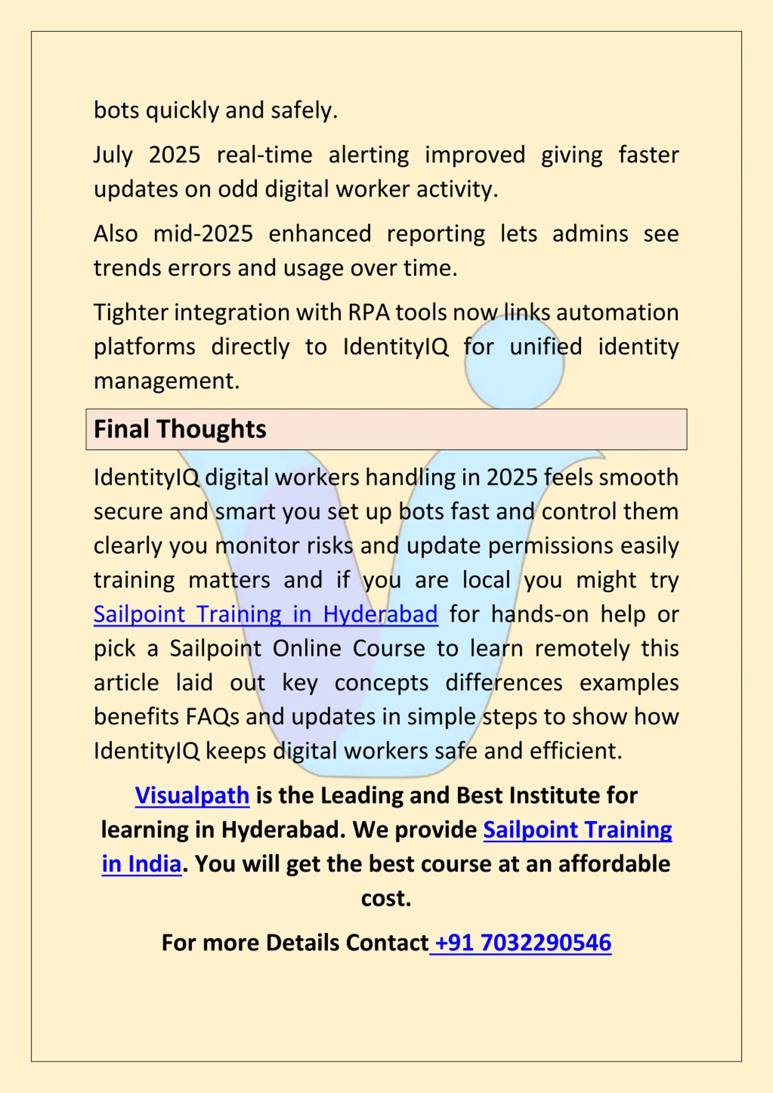 bots quickly and safely. July 2025 real-time alerting improved giving faster updates on odd digital worker activity. Also mid-2025 enhanced reporting lets admins see trends errors and usage over time. Tighter integration with RPA tools now links automation platforms directly to IdentityIQ for unified identity management. Final Thoughts IdentityIQ digital workers handling in 2025 feels smooth secure and smart you set up bots fast and control them clearly you monitor risks and update permissions easily training matters and if you are local you might try Sailpoint Training in Hyderabad for hands-on help or pick a Sailpoint Online Course to learn remotely this article laid out key concepts differences examples benefits FAQs and updates in simple steps to show how IdentityIQ keeps digital workers safe and efficient. Visualpath is the Leading and Best Institute for learning in Hyderabad. We provide Sailpoint Training in India. You will get the best course at an affordable cost. For more Details Contact +91 7032290546