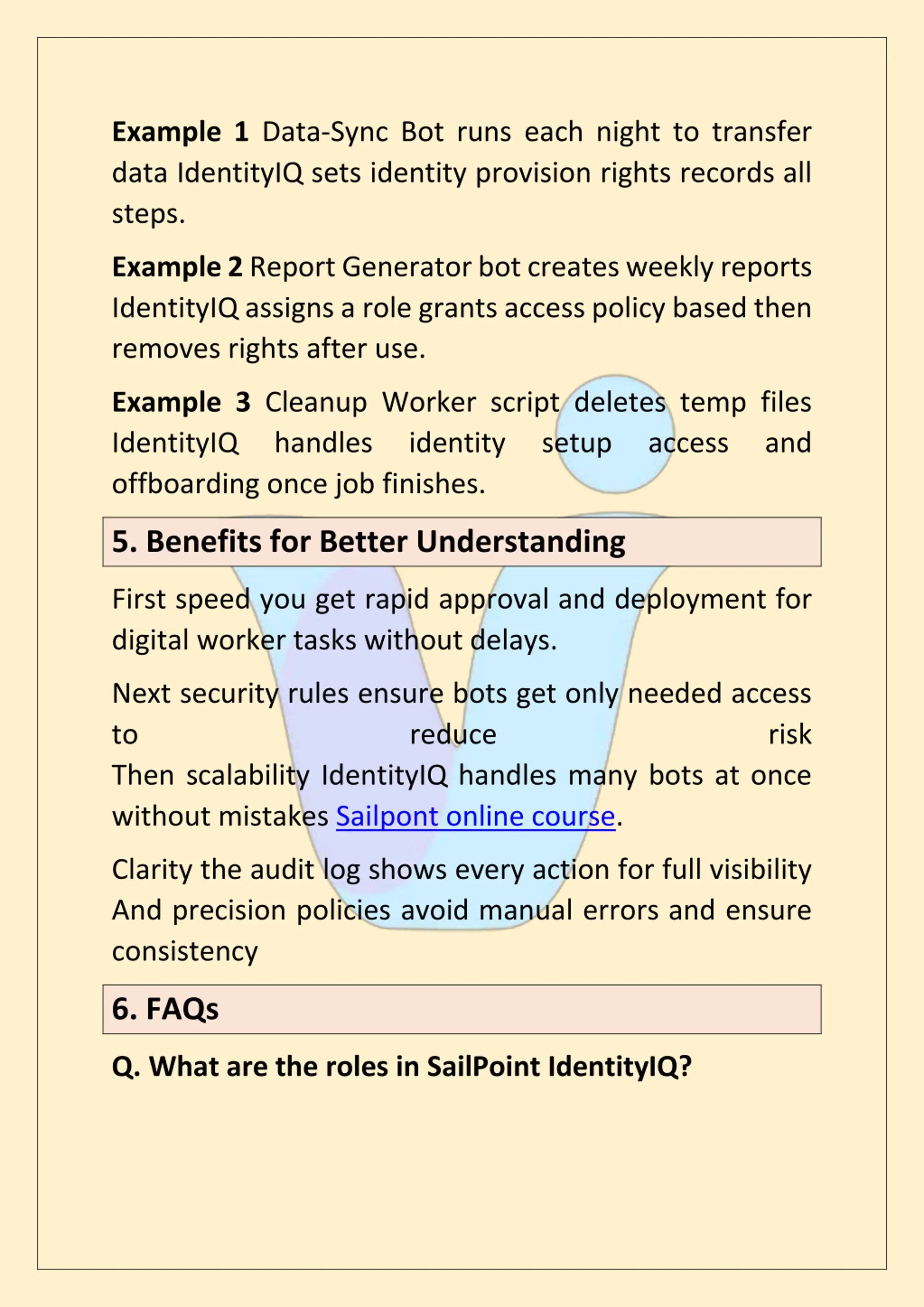 Example 1 Data-Sync Bot runs each night to transfer data IdentityIQ sets identity provision rights records all steps. Example 2 Report Generator bot creates weekly reports IdentityIQ assigns a role grants access policy based then removes rights after use. Example 3 Cleanup Worker script deletes temp files IdentityIQ handles identity offboarding once job finishes. setup access and 5. Benefits for Better Understanding First speed you get rapid approval and deployment for digital worker tasks without delays. Next security rules ensure bots get only needed access to reduce Then scalability IdentityIQ handles many bots at once without mistakes Sailpont online course. risk Clarity the audit log shows every action for full visibility And precision policies avoid manual errors and ensure consistency 6. FAQs Q. What are the roles in SailPoint IdentityIQ?