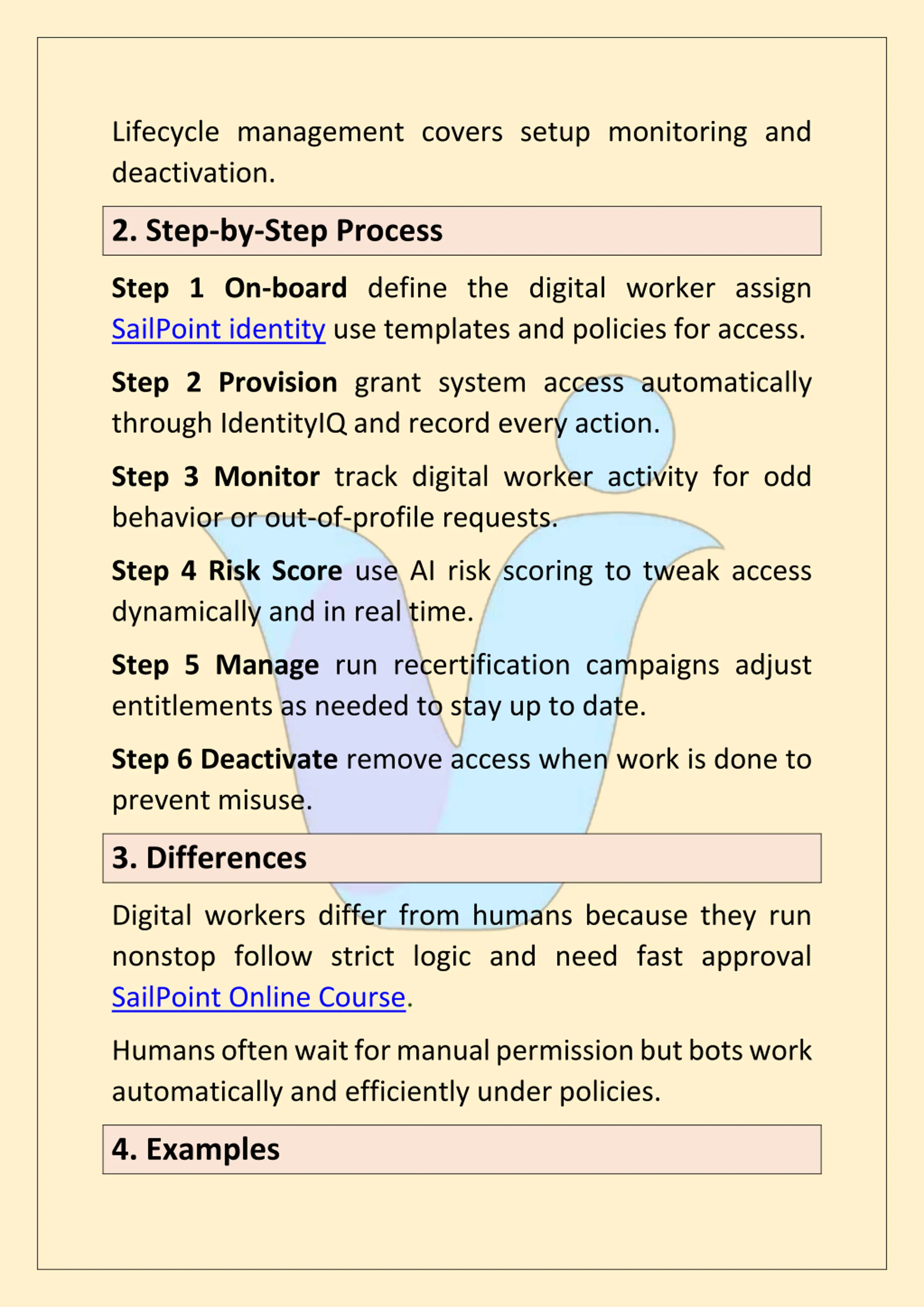 Lifecycle management covers setup monitoring and deactivation. 2. Step-by-Step Process Step 1 On-board define the digital worker assign SailPoint identity use templates and policies for access. Step 2 Provision grant system access automatically through IdentityIQ and record every action. Step 3 Monitor track digital worker activity for odd behavior or out-of-profile requests. Step 4 Risk Score use AI risk scoring to tweak access dynamically and in real time. Step 5 Manage run recertification campaigns adjust entitlements as needed to stay up to date. Step 6 Deactivate remove access when work is done to prevent misuse. 3. Differences Digital workers differ from humans because they run nonstop follow strict logic and need fast approval SailPoint Online Course. Humans often wait for manual permission but bots work automatically and efficiently under policies. 4. Examples