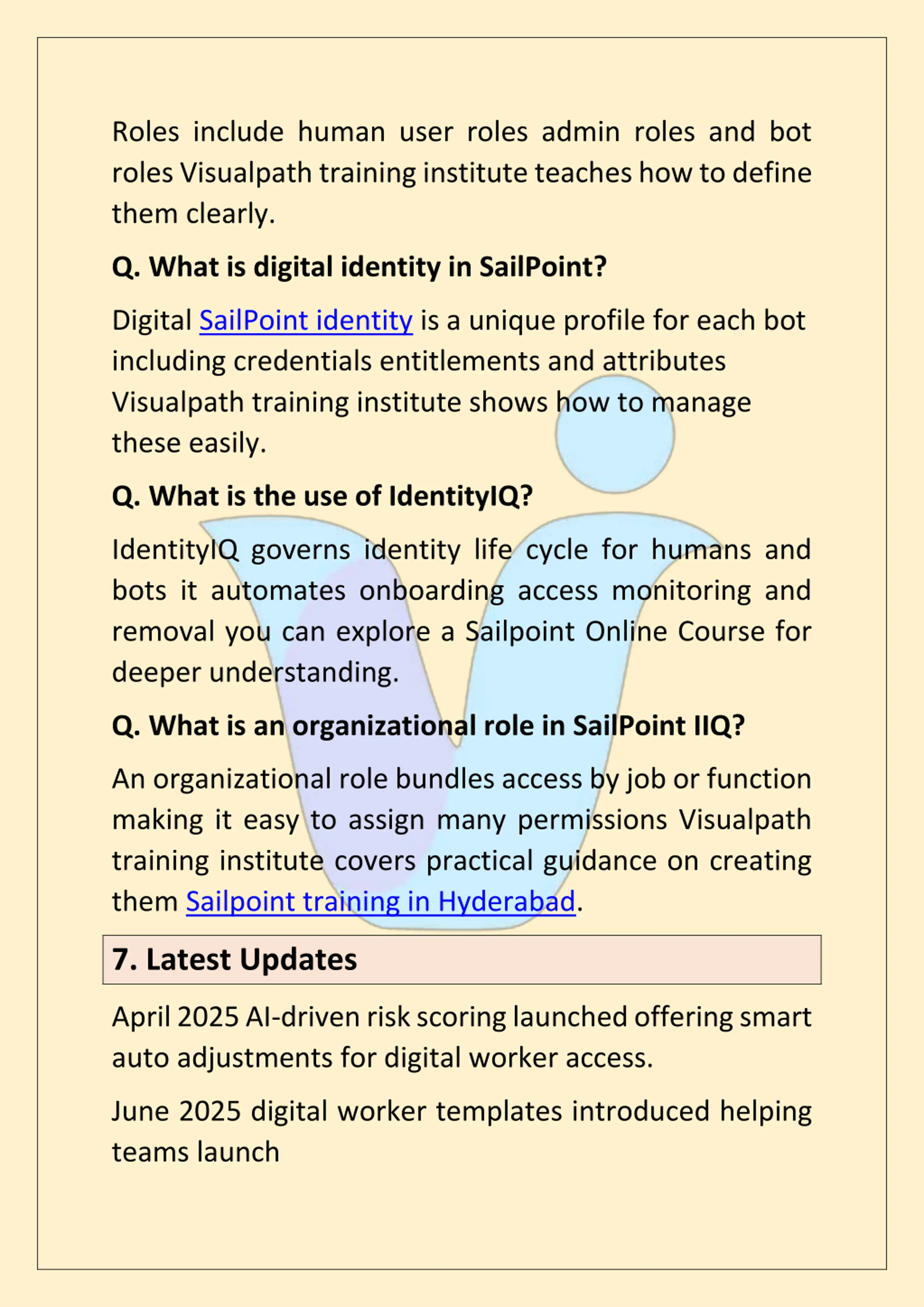 Roles include human user roles admin roles and bot roles Visualpath training institute teaches how to define them clearly. Q. What is digital identity in SailPoint? Digital SailPoint identity is a unique profile for each bot including credentials entitlements and attributes Visualpath training institute shows how to manage these easily. Q. What is the use of IdentityIQ? IdentityIQ governs identity life cycle for humans and bots it automates onboarding access monitoring and removal you can explore a Sailpoint Online Course for deeper understanding. Q. What is an organizational role in SailPoint IIQ? An organizational role bundles access by job or function making it easy to assign many permissions Visualpath training institute covers practical guidance on creating them Sailpoint training in Hyderabad. 7. Latest Updates April 2025 AI-driven risk scoring launched offering smart auto adjustments for digital worker access. June 2025 digital worker templates introduced helping teams launch