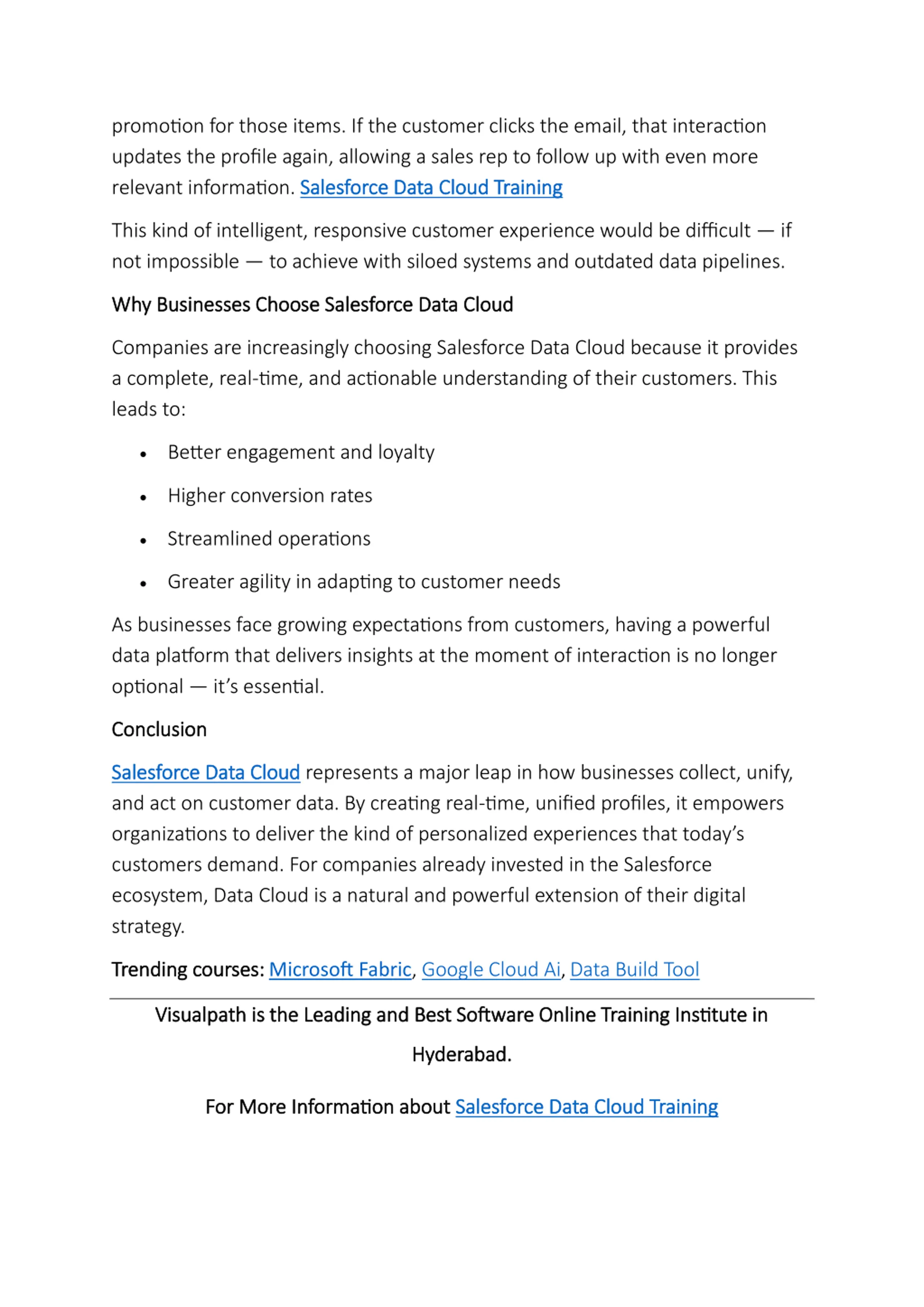 promotion for those items. If the customer clicks the email, that interaction updates the profile again, allowing a sales rep to follow up with even more relevant information. Salesforce Data Cloud Training Salesforce Data Cloud Training This kind of intelligent, responsive customer experience would be difficult if not impossible to achieve with siloed systems and outdated data pipelines. Why Businesses Choose Salesforce Data Cloud Why Businesses Choose Salesforce Data Cloud Companies are increasingly choosing Salesforce Data Cloud because it provides a complete, real-time, and actionable understanding of their customers. This leads to: Better engagement and loyalty Higher conversion rates Streamlined operations Greater agility in adapting to customer needs As businesses face growing expectations from customers, having a powerful data platform that delivers insights at the moment of interaction is no longer optional it s essential. Conclusion Conclusion Salesforce Data Cloud Salesforce Data Cloud represents a major leap in how businesses collect, unify, and act on customer data. By creating real-time, unified profiles, it empowers organizations to deliver the kind of personalized experiences that today s customers demand. For companies already invested in the Salesforce ecosystem, Data Cloud is a natural and powerful extension of their digital strategy. Trending courses: Trending courses:Microsoft Fabric, Google Cloud Ai, Data Build Tool Visualpath is the Leading and Best Software Online Training Institute in Visualpath is the Leading and Best Software Online Training Institute in Hyderabad. Hyderabad. For More Information about For More Information about Salesforce Data Cloud Training Salesforce Data Cloud Training