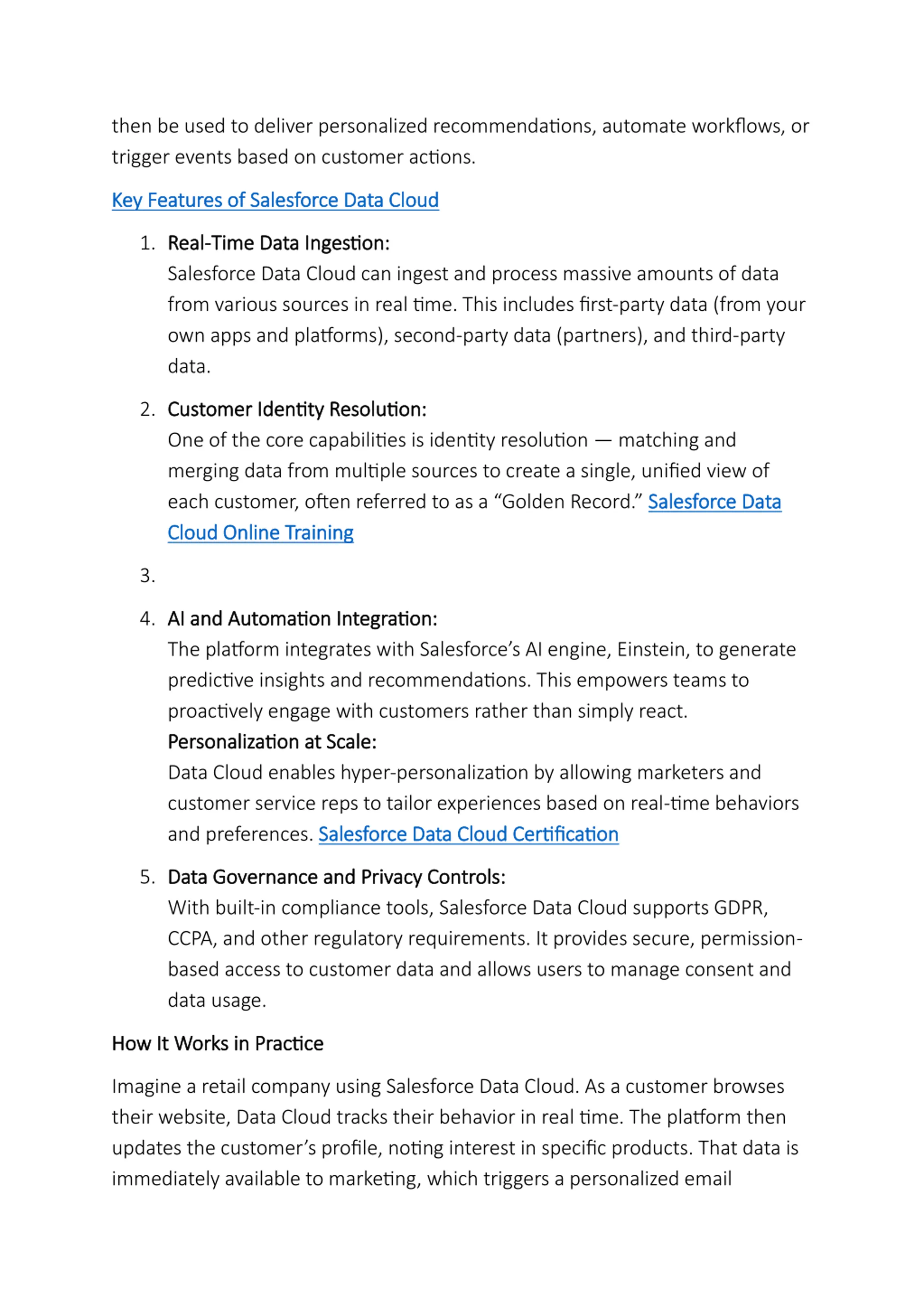 then be used to deliver personalized recommendations, automate workflows, or trigger events based on customer actions. Key Features of Salesforce Data Cloud Key Features of Salesforce Data Cloud 1.Real Real- -Time Data Ingestion: Time Data Ingestion: Salesforce Data Cloud can ingest and process massive amounts of data from various sources in real time. This includes first-party data (from your own apps and platforms), second-party data (partners), and third-party data. 2.Customer Identity Resolution: Customer Identity Resolution: One of the core capabilities is identity resolution matching and merging data from multiple sources to create a single, unified view of each customer, often referred to as a Golden Record. Salesforce Data Cloud Online Training Cloud Online Training Salesforce Data 3. 4.AI and Automation Integration: AI and Automation Integration: The platform integrates with Salesforce s AI engine, Einstein, to generate predictive insights and recommendations. This empowers teams to proactively engage with customers rather than simply react. Personalization at Scale: Personalization at Scale: Data Cloud enables hyper-personalization by allowing marketers and customer service reps to tailor experiences based on real-time behaviors and preferences. Salesforce Data Cloud Certification Salesforce Data Cloud Certification 5.Data Governance and Privacy Controls: Data Governance and Privacy Controls: With built-in compliance tools, Salesforce Data Cloud supports GDPR, CCPA, and other regulatory requirements. It provides secure, permission- based access to customer data and allows users to manage consent and data usage. How It Works in Practice How It Works in Practice Imagine a retail company using Salesforce Data Cloud. As a customer browses their website, Data Cloud tracks their behavior in real time. The platform then updates the customer s profile, noting interest in specific products. That data is immediately available to marketing, which triggers a personalized email