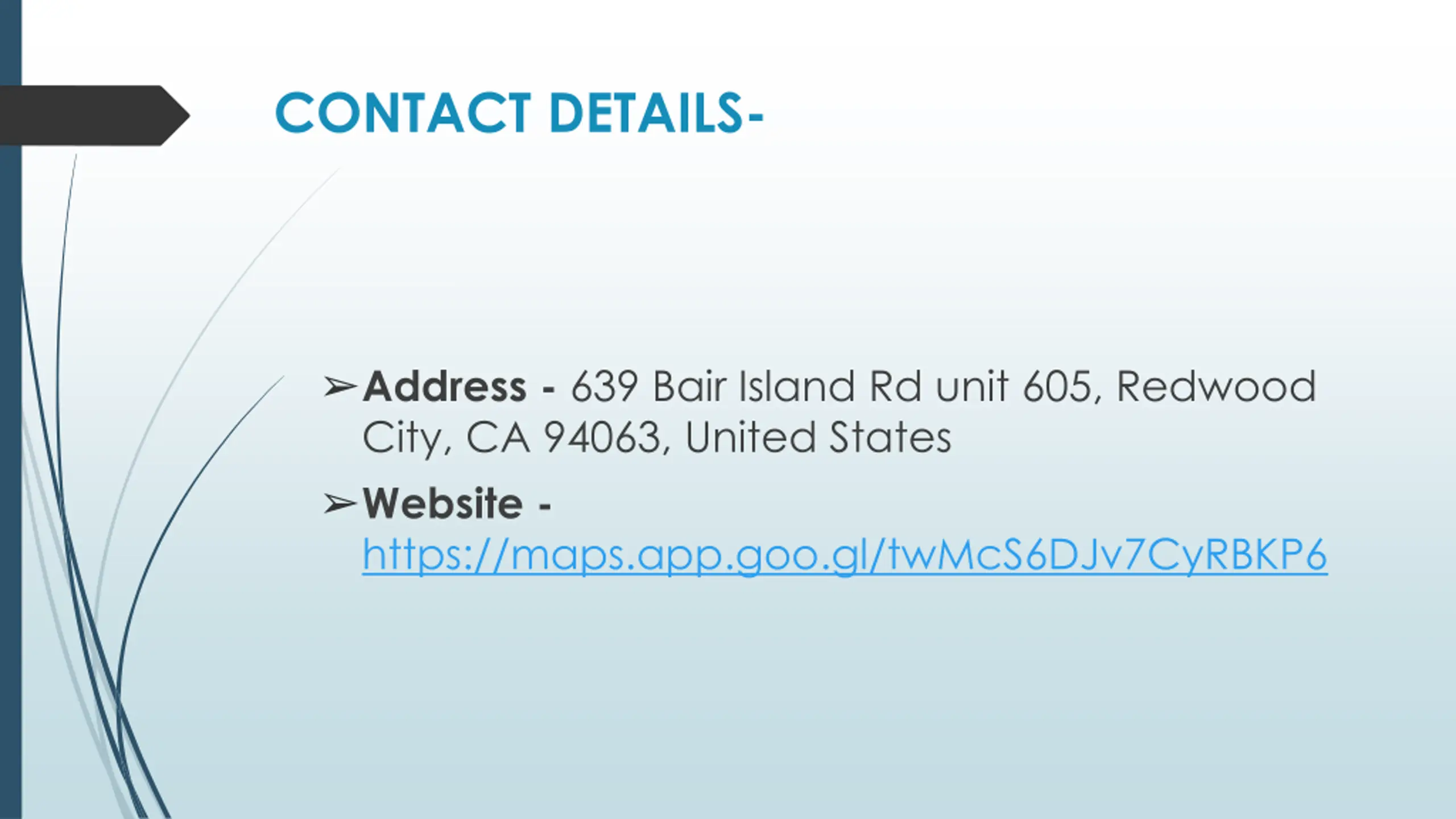 CONTACT DETAILS- Address - 639 Bair Island Rd unit 605, Redwood City, CA 94063, United States Website - https://maps.app.goo.gl/twMcS6DJv7CyRBKP6