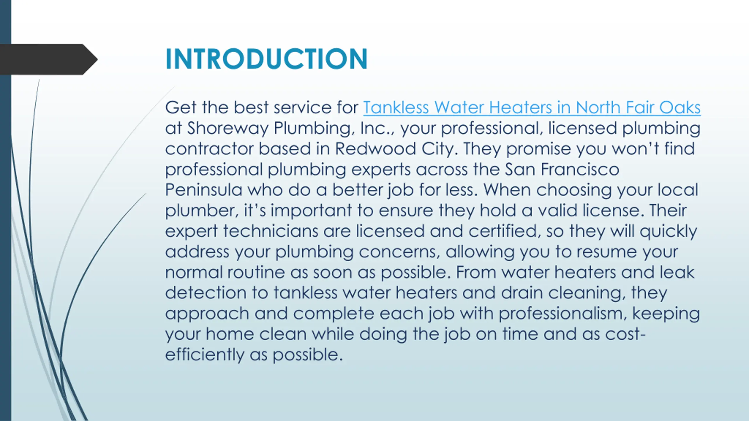 INTRODUCTION Get the best service for Tankless Water Heaters in North Fair Oaks at Shoreway Plumbing, Inc., your professional, licensed plumbing contractor based in Redwood City. They promise you won t find professional plumbing experts across the San Francisco Peninsula who do a better job for less. When choosing your local plumber, it s important to ensure they hold a valid license. Their expert technicians are licensed and certified, so they will quickly address your plumbing concerns, allowing you to resume your normal routine as soon as possible. From water heaters and leak detection to tankless water heaters and drain cleaning, they approach and complete each job with professionalism, keeping your home clean while doing the job on time and as cost- efficiently as possible.