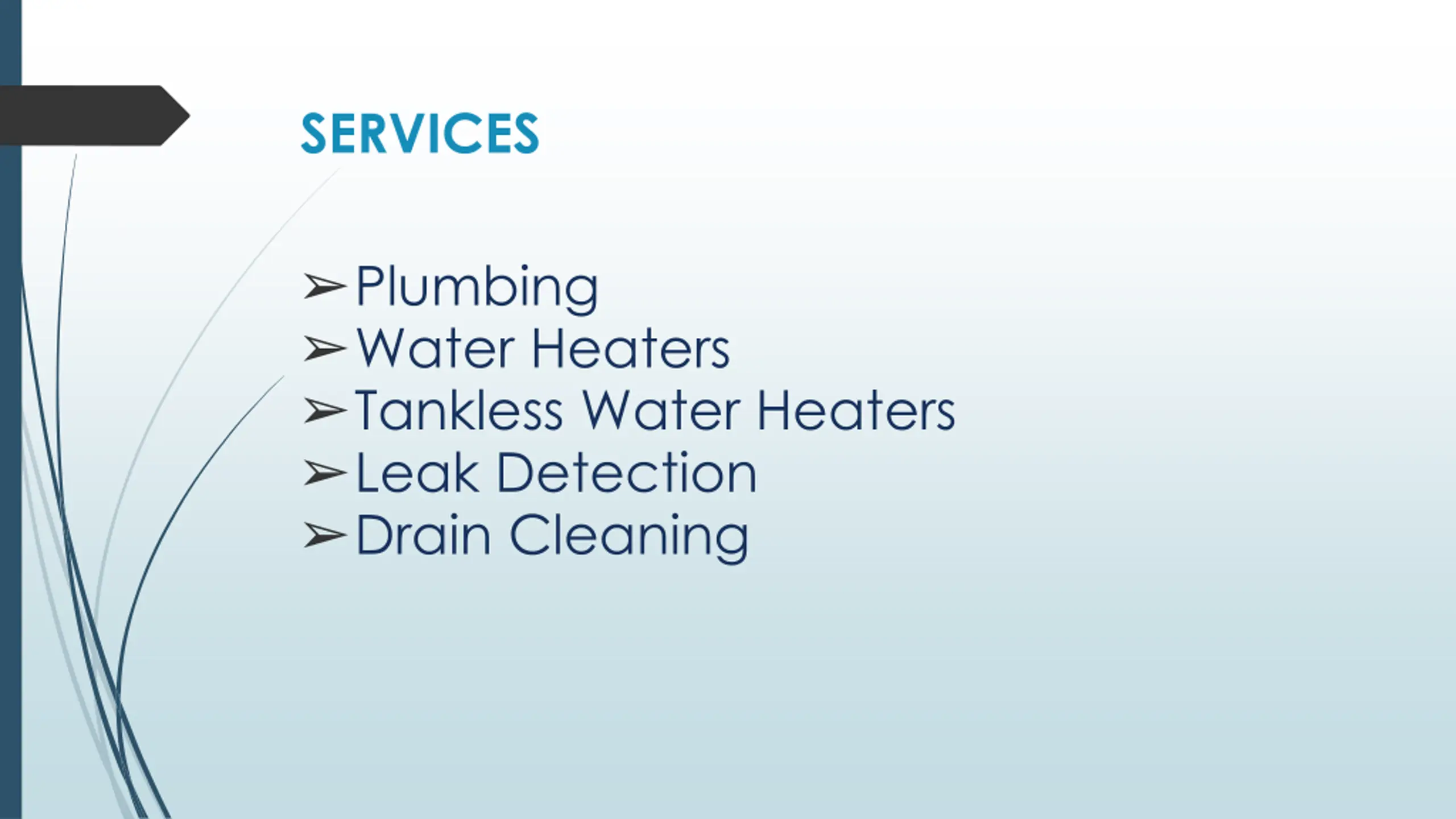 SERVICES Plumbing Water Heaters Tankless Water Heaters Leak Detection Drain Cleaning