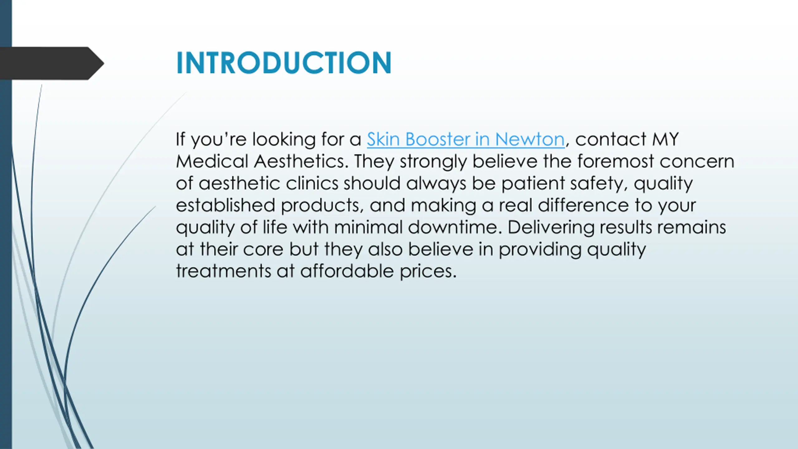 INTRODUCTION If you re looking for a Skin Booster in Newton, contact MY Medical Aesthetics. They strongly believe the foremost concern of aesthetic clinics should always be patient safety, quality established products, and making a real difference to your quality of life with minimal downtime. Delivering results remains at their core but they also believe in providing quality treatments at affordable prices.