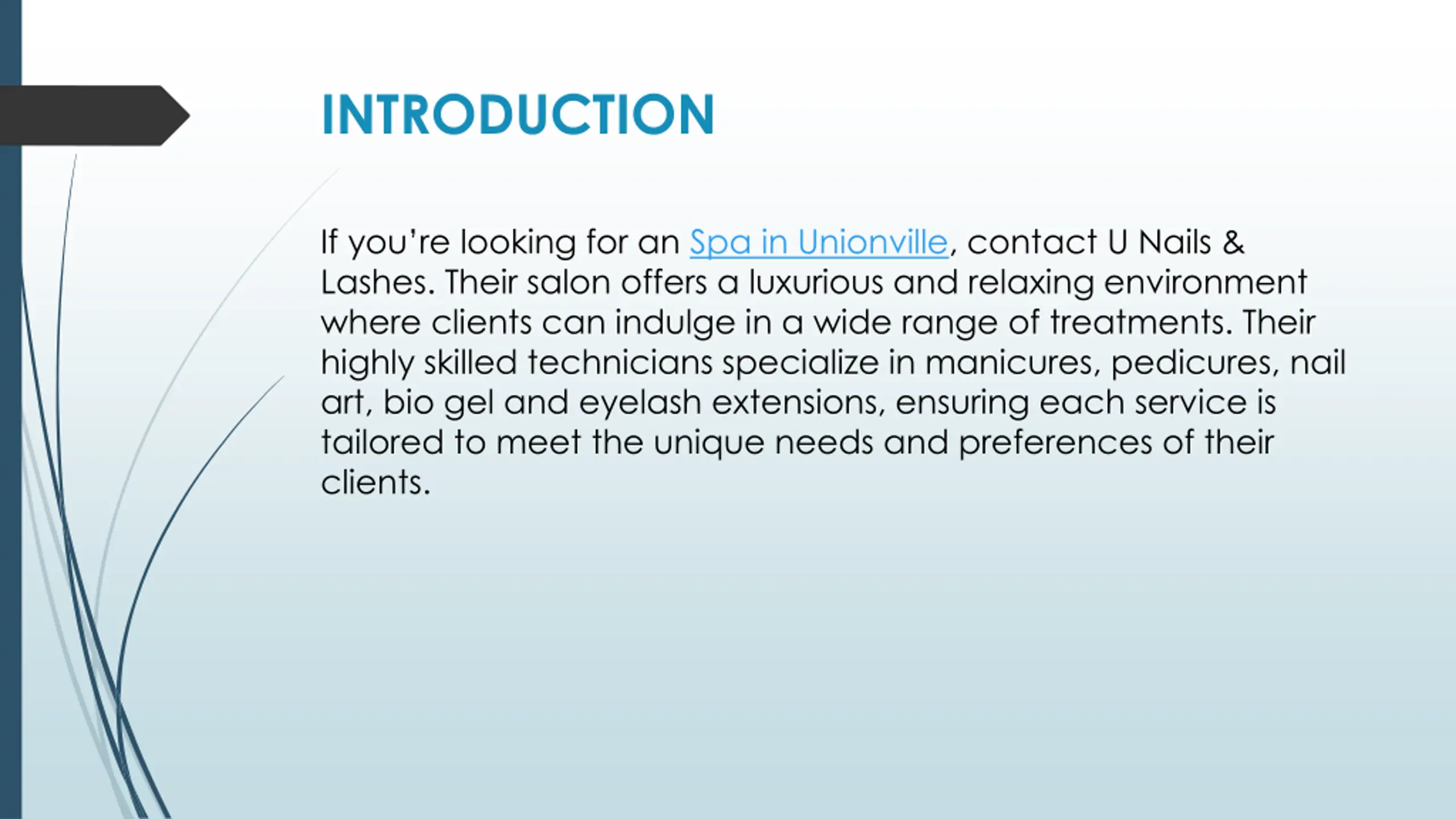 INTRODUCTION If you re looking for an Spa in Unionville, contact U Nails & Lashes. Their salon offers a luxurious and relaxing environment where clients can indulge in a wide range of treatments. Their highly skilled technicians specialize in manicures, pedicures, nail art, bio gel and eyelash extensions, ensuring each service is tailored to meet the unique needs and preferences of their clients.