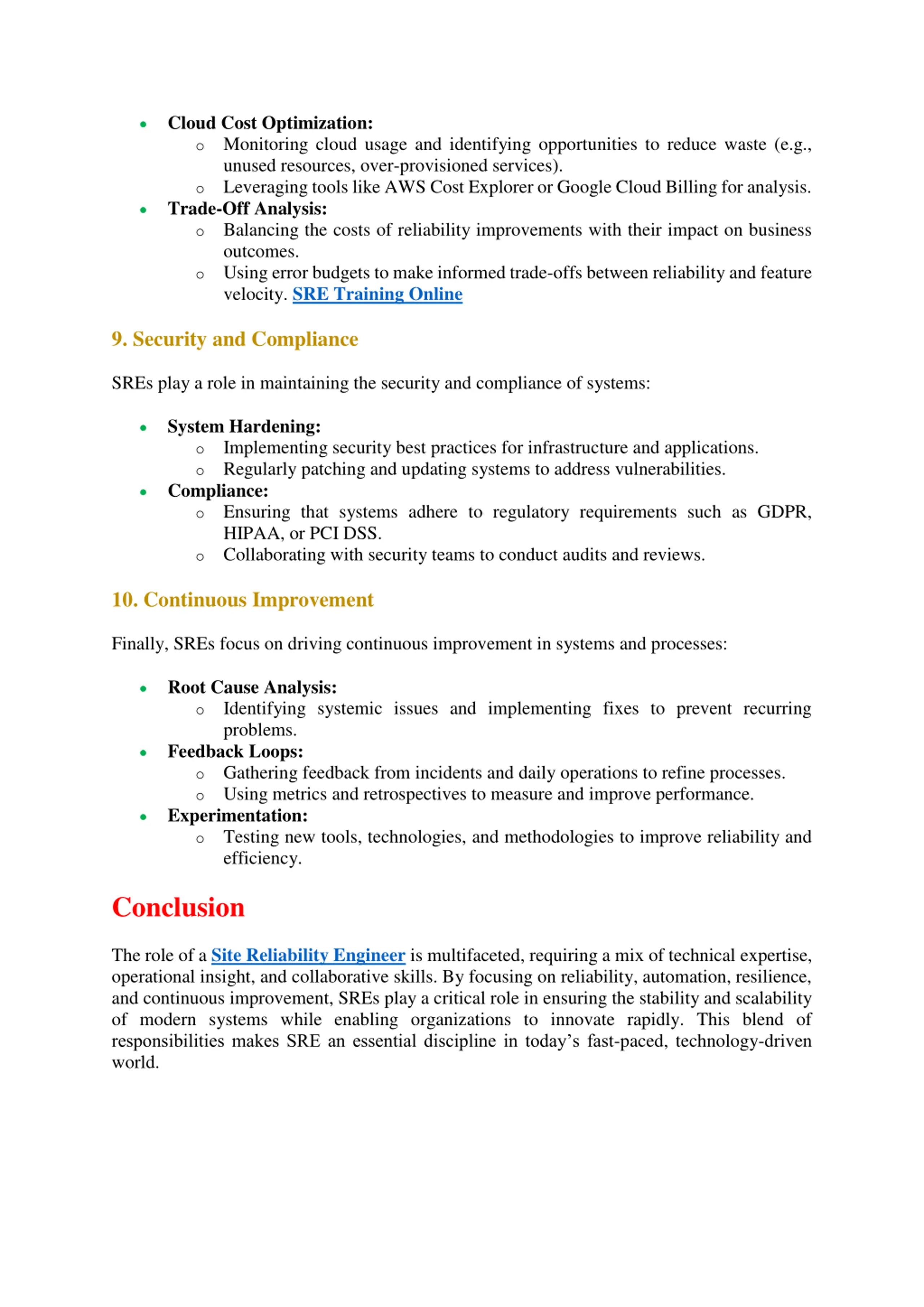 Cloud Cost Optimization: oMonitoring cloud usage and identifying opportunities to reduce waste (e.g., unused resources, over-provisioned services). oLeveraging tools like AWS Cost Explorer or Google Cloud Billing for analysis. Trade-Off Analysis: oBalancing the costs of reliability improvements with their impact on business outcomes. oUsing error budgets to make informed trade-offs between reliability and feature velocity. SRE Training Online 9. Security and Compliance SREs play a role in maintaining the security and compliance of systems: System Hardening: oImplementing security best practices for infrastructure and applications. oRegularly patching and updating systems to address vulnerabilities. Compliance: oEnsuring that systems adhere to regulatory requirements such as GDPR, HIPAA, or PCI DSS. oCollaborating with security teams to conduct audits and reviews. 10. Continuous Improvement Finally, SREs focus on driving continuous improvement in systems and processes: Root Cause Analysis: oIdentifying systemic issues and implementing fixes to prevent recurring problems. Feedback Loops: oGathering feedback from incidents and daily operations to refine processes. oUsing metrics and retrospectives to measure and improve performance. Experimentation: oTesting new tools, technologies, and methodologies to improve reliability and efficiency. Conclusion The role of a Site Reliability Engineer is multifaceted, requiring a mix of technical expertise, operational insight, and collaborative skills. By focusing on reliability, automation, resilience, and continuous improvement, SREs play a critical role in ensuring the stability and scalability of modern systems while enabling organizations to innovate rapidly. This blend of responsibilities makes SRE an essential discipline in today s fast-paced, technology-driven world.