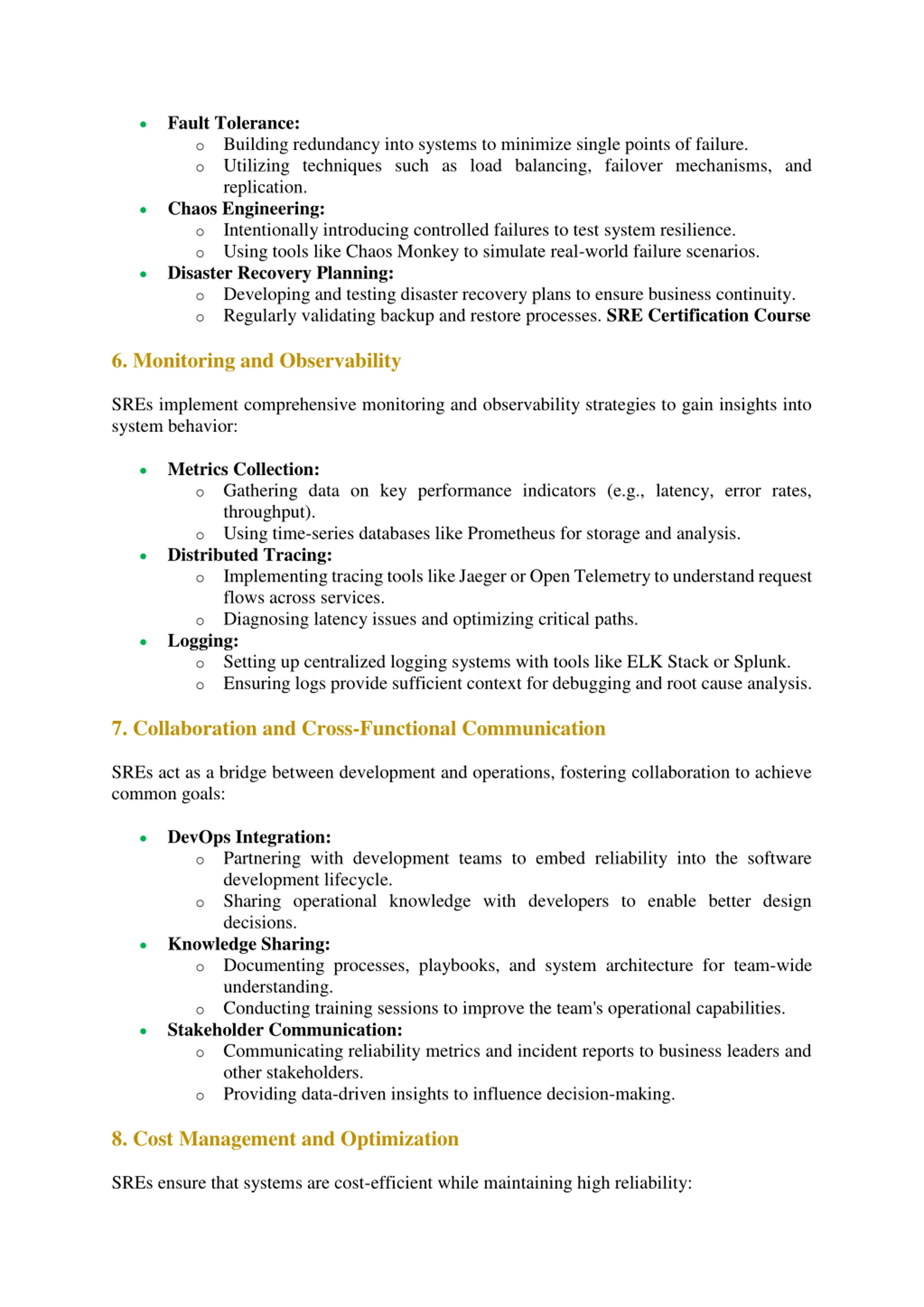 Fault Tolerance: oBuilding redundancy into systems to minimize single points of failure. oUtilizing techniques such as load balancing, failover mechanisms, and replication. Chaos Engineering: oIntentionally introducing controlled failures to test system resilience. oUsing tools like Chaos Monkey to simulate real-world failure scenarios. Disaster Recovery Planning: oDeveloping and testing disaster recovery plans to ensure business continuity. oRegularly validating backup and restore processes. SRE Certification Course 6. Monitoring and Observability SREs implement comprehensive monitoring and observability strategies to gain insights into system behavior: Metrics Collection: oGathering data on key performance indicators (e.g., latency, error rates, throughput). oUsing time-series databases like Prometheus for storage and analysis. Distributed Tracing: oImplementing tracing tools like Jaeger or Open Telemetry to understand request flows across services. oDiagnosing latency issues and optimizing critical paths. Logging: oSetting up centralized logging systems with tools like ELK Stack or Splunk. oEnsuring logs provide sufficient context for debugging and root cause analysis. 7. Collaboration and Cross-Functional Communication SREs act as a bridge between development and operations, fostering collaboration to achieve common goals: DevOps Integration: oPartnering with development teams to embed reliability into the software development lifecycle. oSharing operational knowledge with developers to enable better design decisions. Knowledge Sharing: oDocumenting processes, playbooks, and system architecture for team-wide understanding. oConducting training sessions to improve the team's operational capabilities. Stakeholder Communication: oCommunicating reliability metrics and incident reports to business leaders and other stakeholders. oProviding data-driven insights to influence decision-making. 8. Cost Management and Optimization SREs ensure that systems are cost-efficient while maintaining high reliability: