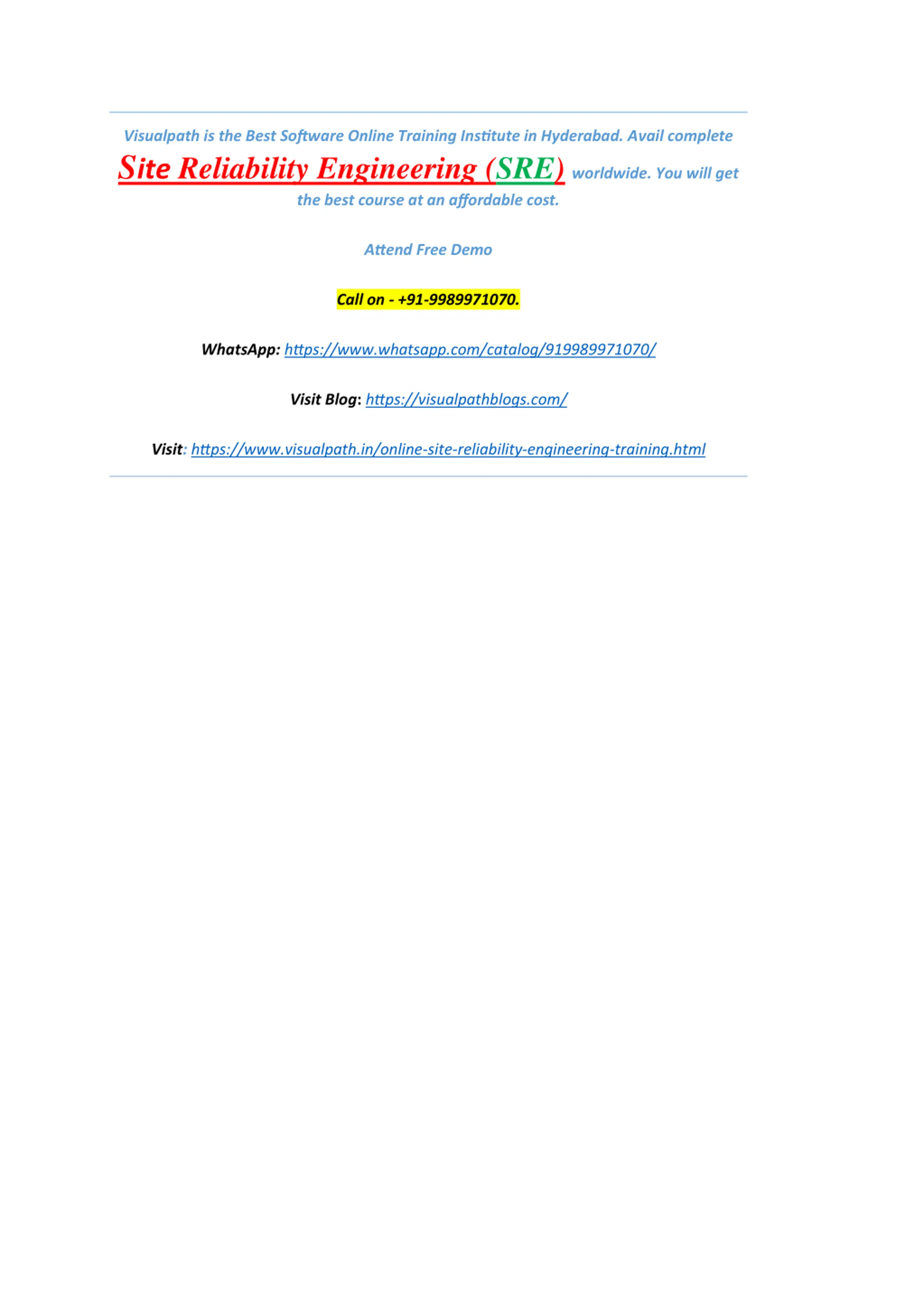 Visualpath is the Best Software Online Training Institute in Hyderabad. Avail complete Site Reliability Engineering (SRE)worldwide. You will get the best course at an affordable cost. Attend Free Demo Call on - +91-9989971070. WhatsApp: https://www.whatsapp.com/catalog/919989971070/ Visit Blog:https://visualpathblogs.com/ Visit:https://www.visualpath.in/online-site-reliability-engineering-training.html