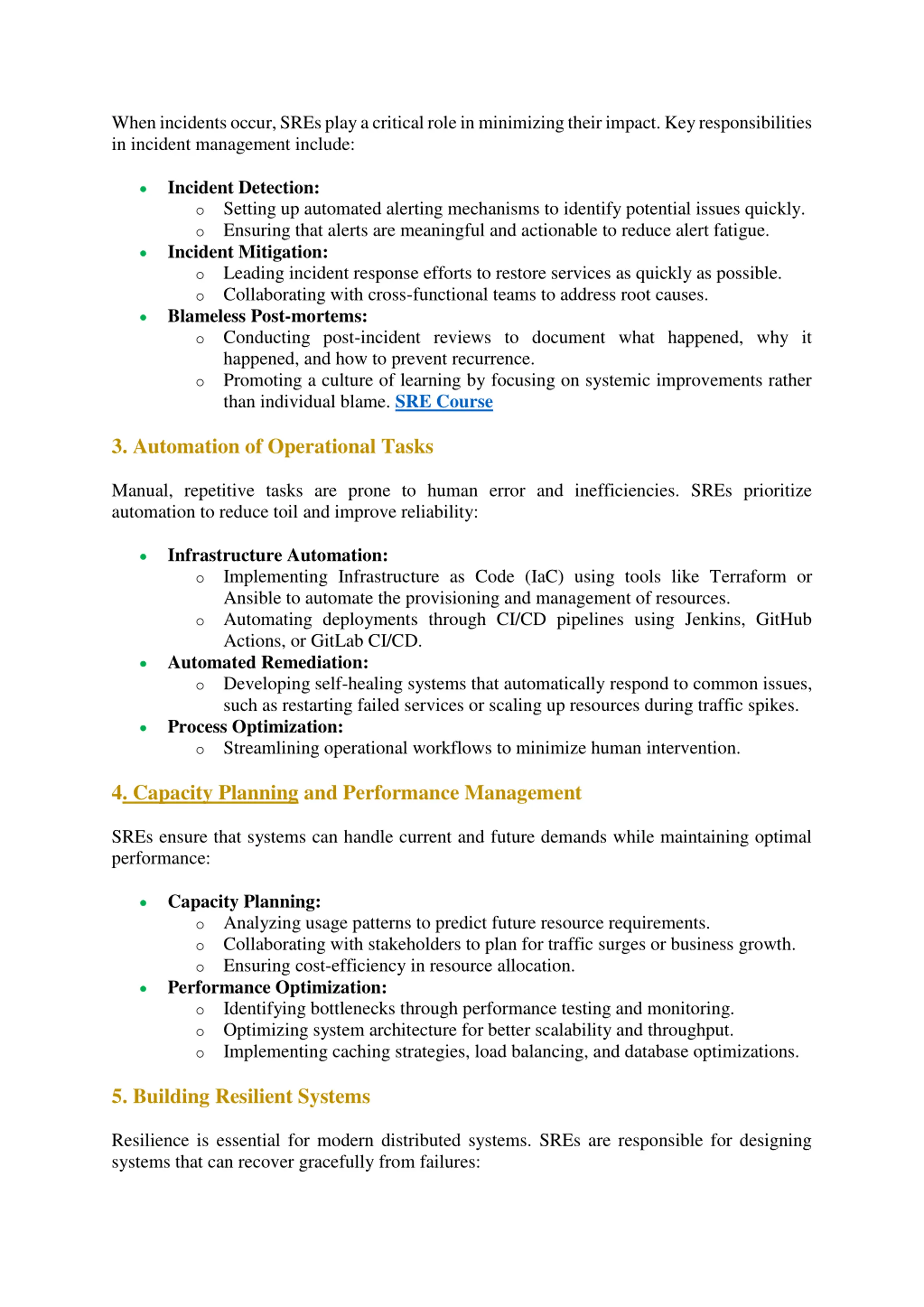 When incidents occur, SREs play a critical role in minimizing their impact. Key responsibilities in incident management include: Incident Detection: oSetting up automated alerting mechanisms to identify potential issues quickly. oEnsuring that alerts are meaningful and actionable to reduce alert fatigue. Incident Mitigation: oLeading incident response efforts to restore services as quickly as possible. oCollaborating with cross-functional teams to address root causes. Blameless Post-mortems: oConducting post-incident reviews to document what happened, why it happened, and how to prevent recurrence. oPromoting a culture of learning by focusing on systemic improvements rather than individual blame. SRE Course 3. Automation of Operational Tasks Manual, repetitive tasks are prone to human error and inefficiencies. SREs prioritize automation to reduce toil and improve reliability: Infrastructure Automation: oImplementing Infrastructure as Code (IaC) using tools like Terraform or Ansible to automate the provisioning and management of resources. oAutomating deployments through CI/CD pipelines using Jenkins, GitHub Actions, or GitLab CI/CD. Automated Remediation: oDeveloping self-healing systems that automatically respond to common issues, such as restarting failed services or scaling up resources during traffic spikes. Process Optimization: oStreamlining operational workflows to minimize human intervention. 4. Capacity Planning and Performance Management SREs ensure that systems can handle current and future demands while maintaining optimal performance: Capacity Planning: oAnalyzing usage patterns to predict future resource requirements. oCollaborating with stakeholders to plan for traffic surges or business growth. oEnsuring cost-efficiency in resource allocation. Performance Optimization: oIdentifying bottlenecks through performance testing and monitoring. oOptimizing system architecture for better scalability and throughput. oImplementing caching strategies, load balancing, and database optimizations. 5. Building Resilient Systems Resilience is essential for modern distributed systems. SREs are responsible for designing systems that can recover gracefully from failures: