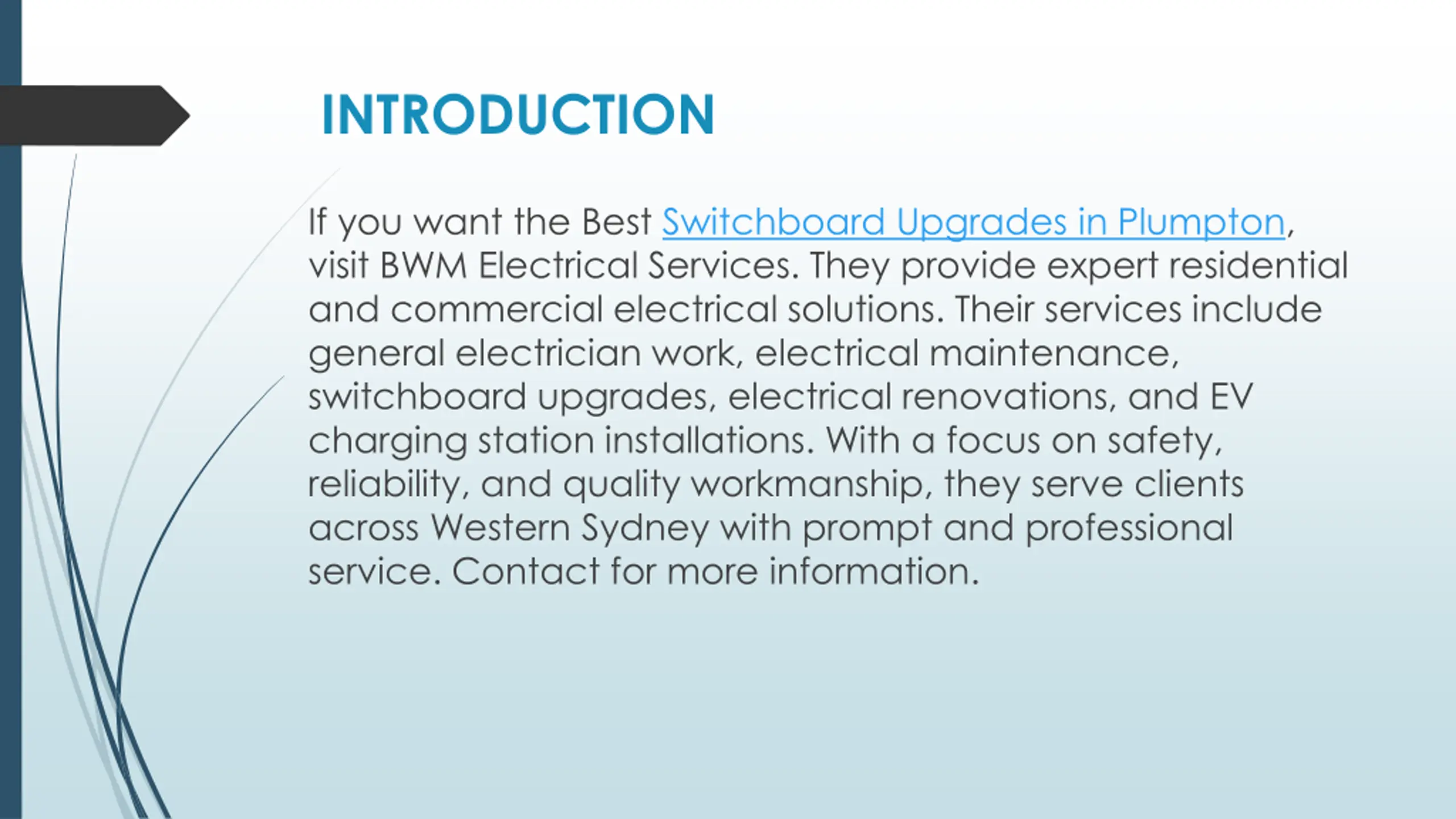 INTRODUCTION If you want the Best Switchboard Upgrades in Plumpton, visit BWM Electrical Services. They provide expert residential and commercial electrical solutions. Their services include general electrician work, electrical maintenance, switchboard upgrades, electrical renovations, and EV charging station installations. With a focus on safety, reliability, and quality workmanship, they serve clients across Western Sydney with prompt and professional service. Contact for more information.