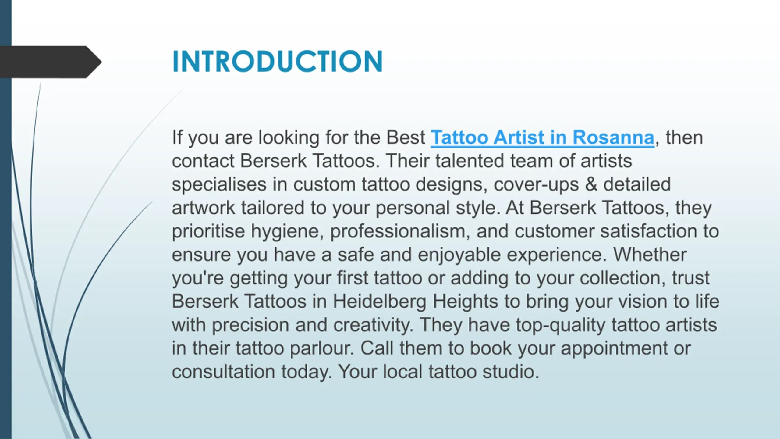 INTRODUCTION If you are looking for the Best Tattoo Artist in Rosanna, then contact Berserk Tattoos. Their talented team of artists specialises in custom tattoo designs, cover-ups & detailed artwork tailored to your personal style. At Berserk Tattoos, they prioritise hygiene, professionalism, and customer satisfaction to ensure you have a safe and enjoyable experience. Whether you're getting your first tattoo or adding to your collection, trust Berserk Tattoos in Heidelberg Heights to bring your vision to life with precision and creativity. They have top-quality tattoo artists in their tattoo parlour. Call them to book your appointment or consultation today. Your local tattoo studio.