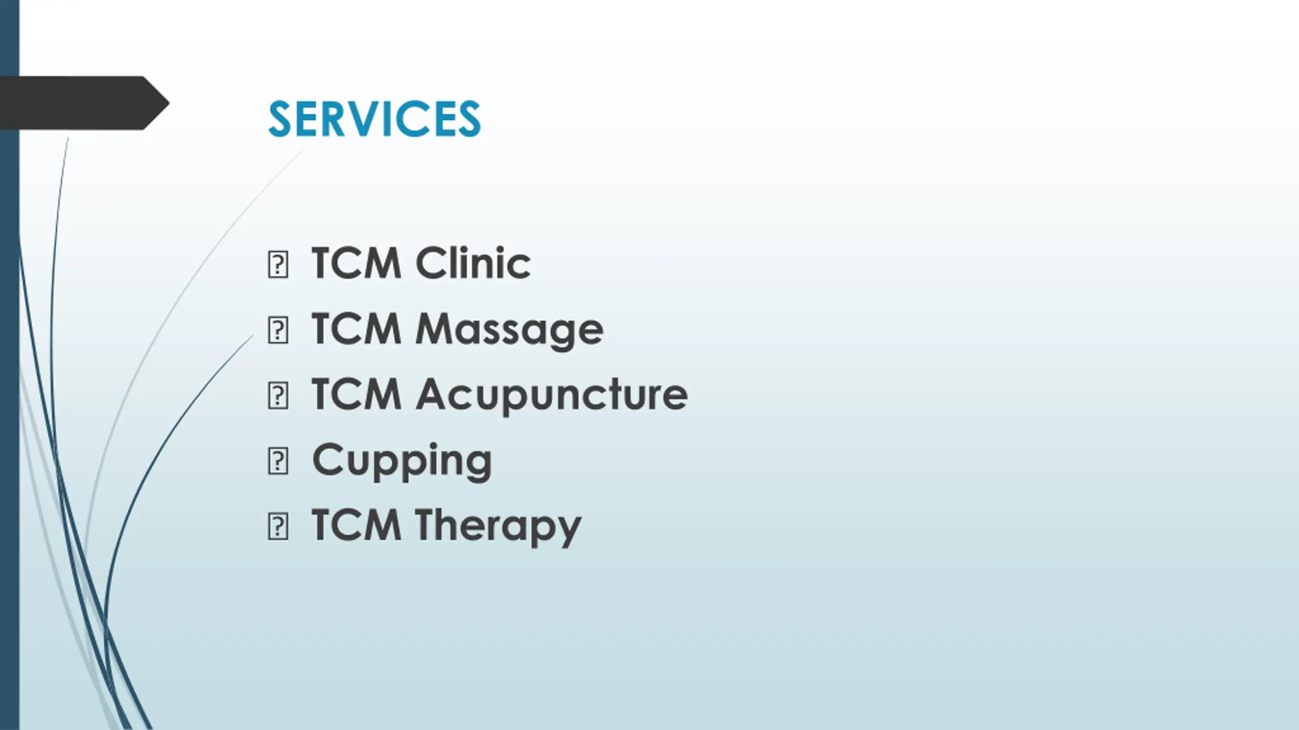 SERVICES ? TCM Clinic ? TCM Massage ? TCM Acupuncture ? Cupping ? TCM Therapy