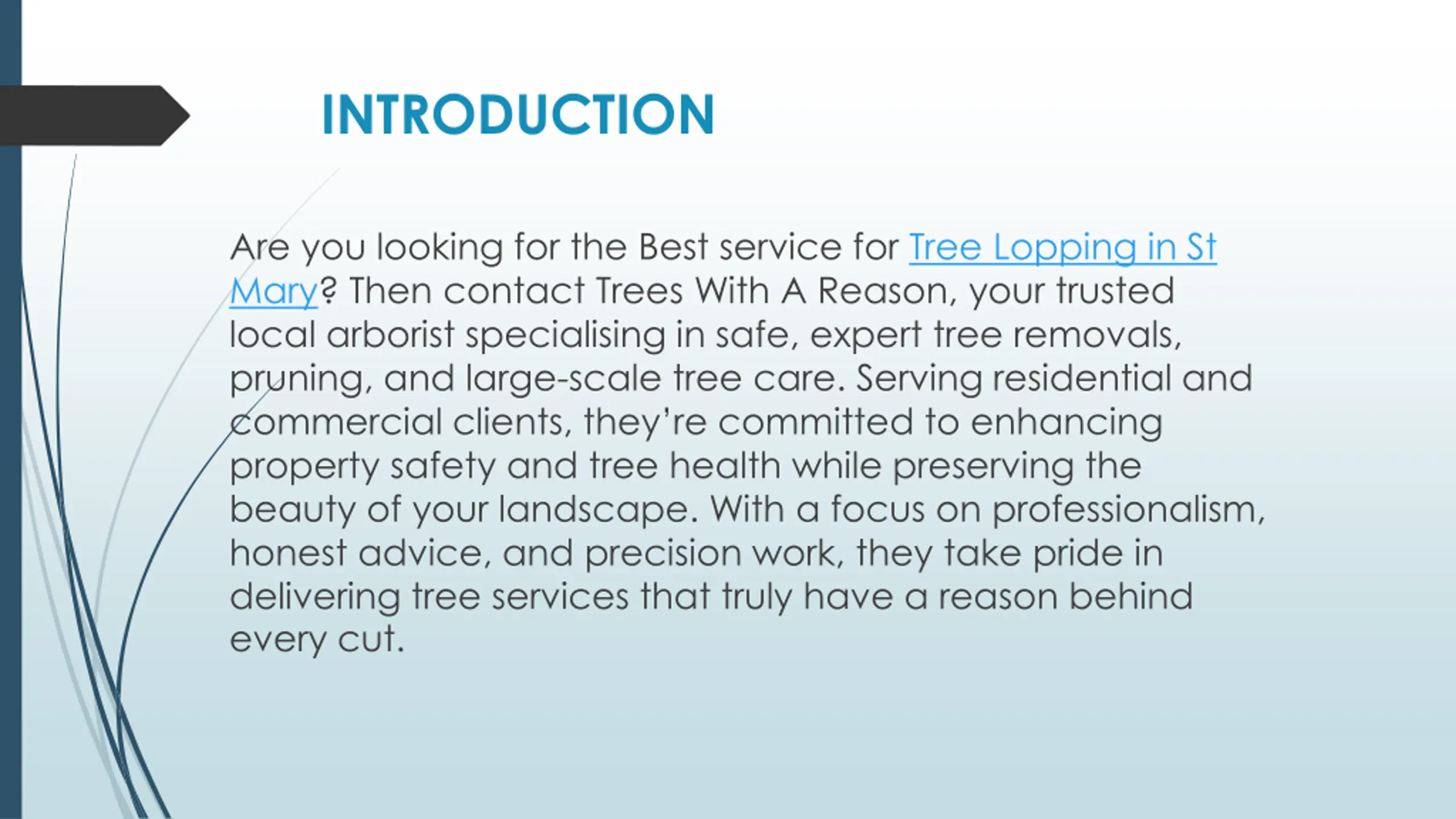 INTRODUCTION Are you looking for the Best service for Tree Lopping in St Mary? Then contact Trees With A Reason, your trusted local arborist specialising in safe, expert tree removals, pruning, and large-scale tree care. Serving residential and commercial clients, they re committed to enhancing property safety and tree health while preserving the beauty of your landscape. With a focus on professionalism, honest advice, and precision work, they take pride in delivering tree services that truly have a reason behind every cut.